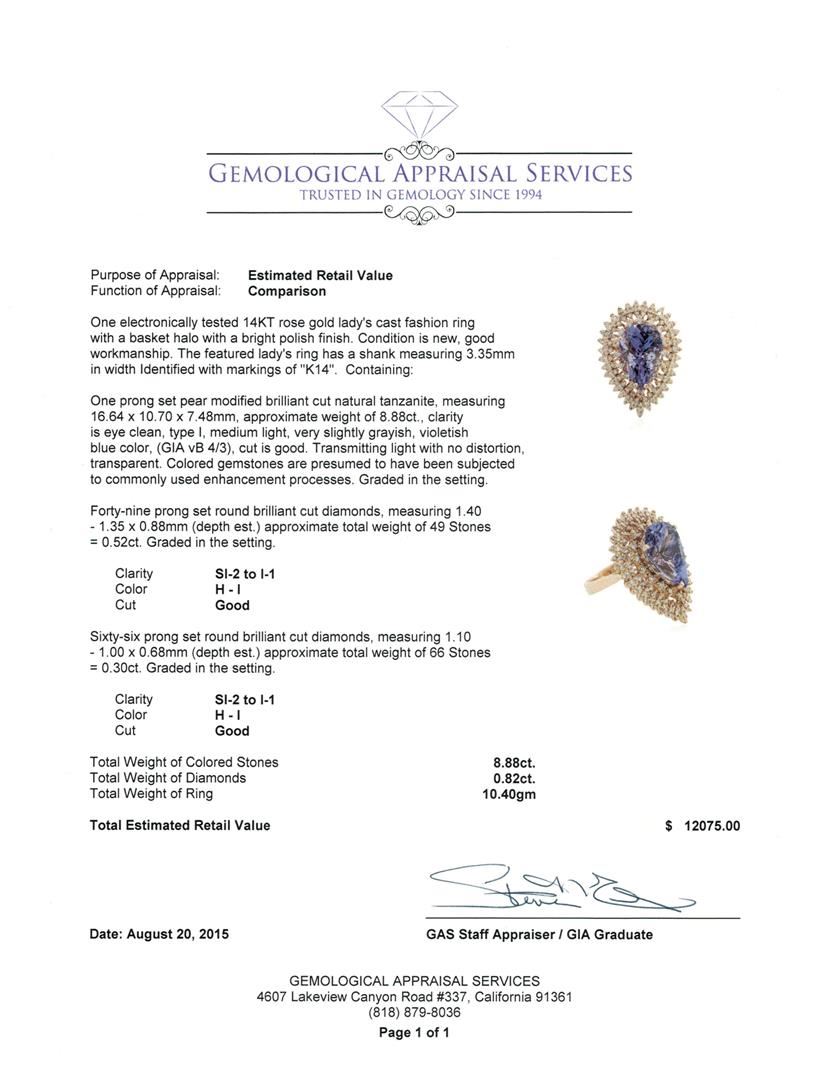One electronically tested 14KT rose gold lady's cast fashion ring with a basket halo with a bright polish finish. The featured lady's ring has a shank measuring 3.35mm in width Identified with markings of "K14". Condition is new, good workmanship. Containing: One prong set pear modified brilliant cut natural tanzanite, measuring 16.64 x 10.70 x 7.48mm, approximate weight of 8.88ct., clarity is eye clean, type I, medium light, very slightly grayish, violetish blue color, (GIA vB 4/3), cut is good. Transmitting light with no distortion, transparent. Colored gemstones are presumed to have been subjected to commonly used enhancement processes. Graded in the setting. Forty-Nine prong set round brilliant cut diamonds, measuring 1.40 - 1.35 x 0.88mm (depth est.) approximate total weight of 49 Stones = 0.52ct. Graded in the setting. Clarity: SI-2 to I-1. Color: H - I. Cut Good Sixty-Six prong set round brilliant cut diamonds, measuring 1.10 - 1.00 x 0.68mm (depth est.) approximate total weight of 66 Stones = 0.30ct. Graded in the setting. Clarity: SI-2 to I-1. Color: H - I. Cut Good. Total Weight of Colored Stones 8.88ct. Total Weight of Diamonds 0.82ct. Total Weight of Ring 10.40gm. GAS Appraised at $12,075.00.