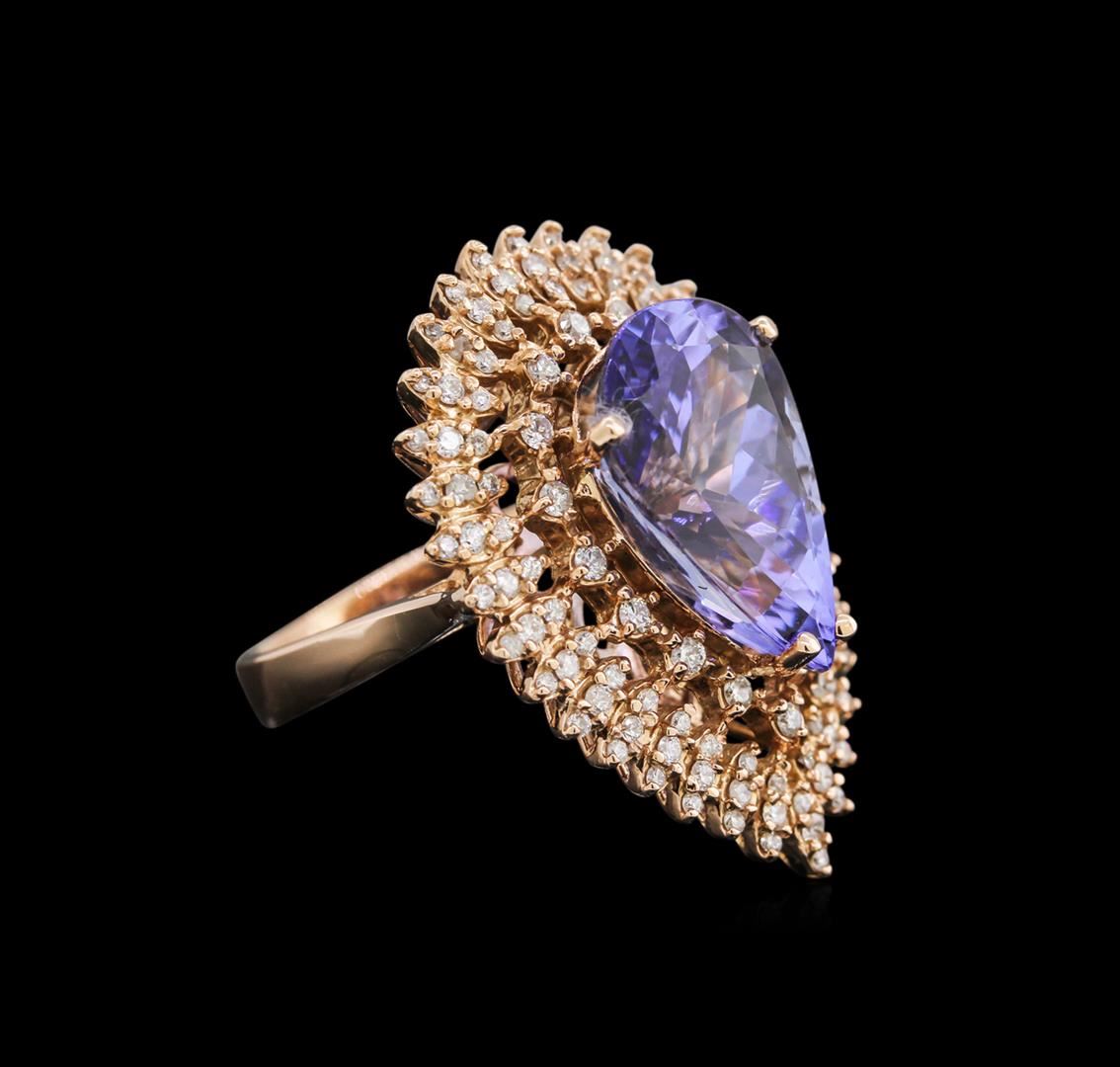 One electronically tested 14KT rose gold lady's cast fashion ring with a basket halo with a bright polish finish. The featured lady's ring has a shank measuring 3.35mm in width Identified with markings of "K14". Condition is new, good workmanship. Containing: One prong set pear modified brilliant cut natural tanzanite, measuring 16.64 x 10.70 x 7.48mm, approximate weight of 8.88ct., clarity is eye clean, type I, medium light, very slightly grayish, violetish blue color, (GIA vB 4/3), cut is good. Transmitting light with no distortion, transparent. Colored gemstones are presumed to have been subjected to commonly used enhancement processes. Graded in the setting. Forty-Nine prong set round brilliant cut diamonds, measuring 1.40 - 1.35 x 0.88mm (depth est.) approximate total weight of 49 Stones = 0.52ct. Graded in the setting. Clarity: SI-2 to I-1. Color: H - I. Cut Good Sixty-Six prong set round brilliant cut diamonds, measuring 1.10 - 1.00 x 0.68mm (depth est.) approximate total weight of 66 Stones = 0.30ct. Graded in the setting. Clarity: SI-2 to I-1. Color: H - I. Cut Good. Total Weight of Colored Stones 8.88ct. Total Weight of Diamonds 0.82ct. Total Weight of Ring 10.40gm. GAS Appraised at $12,075.00.