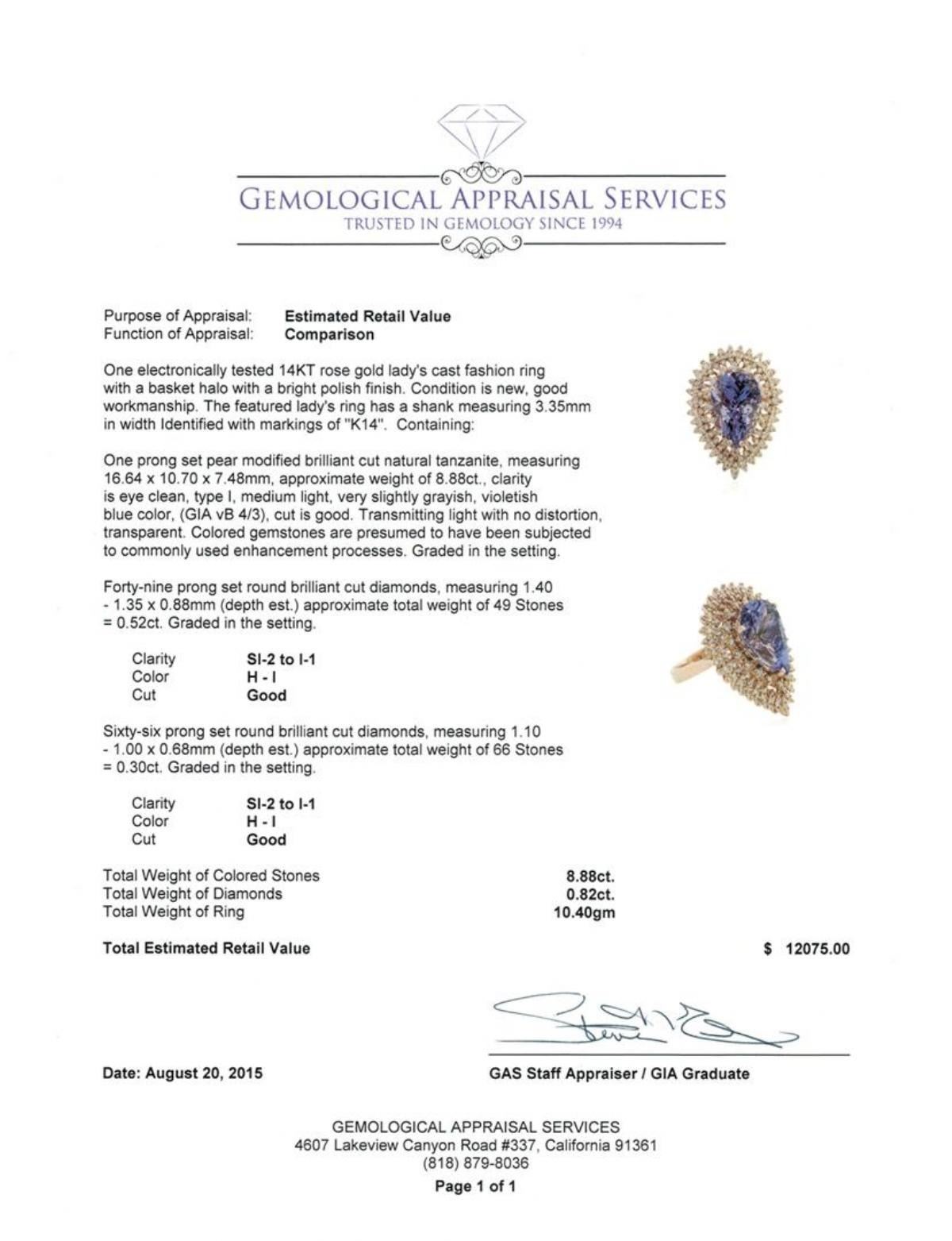 One electronically tested 14KT rose gold lady's cast fashion ring with a basket halo with a bright polish finish. The featured lady's ring has a shank measuring 3.35mm in width Identified with markings of "K14". Condition is new, good workmanship. Containing: One prong set pear modified brilliant cut natural tanzanite, measuring 16.64 x 10.70 x 7.48mm, approximate weight of 8.88ct., clarity is eye clean, type I, medium light, very slightly grayish, violetish blue color, (GIA vB 4/3), cut is good. Transmitting light with no distortion, transparent. Colored gemstones are presumed to have been subjected to commonly used enhancement processes. Graded in the setting. Forty-Nine prong set round brilliant cut diamonds, measuring 1.40 - 1.35 x 0.88mm (depth est.) approximate total weight of 49 Stones = 0.52ct. Graded in the setting. Clarity: SI-2 to I-1. Color: H - I. Cut Good Sixty-Six prong set round brilliant cut diamonds, measuring 1.10 - 1.00 x 0.68mm (depth est.) approximate total weight of 66 Stones = 0.30 ct. Graded in the setting. Clarity: SI-2 to I-1. Color: H - I. Cut Good. Total Weight of Colored Stones 8.88ct. Total Weight of Diamonds 0.82ct. Total Weight of Ring 10.40gm. GAS Appraised.