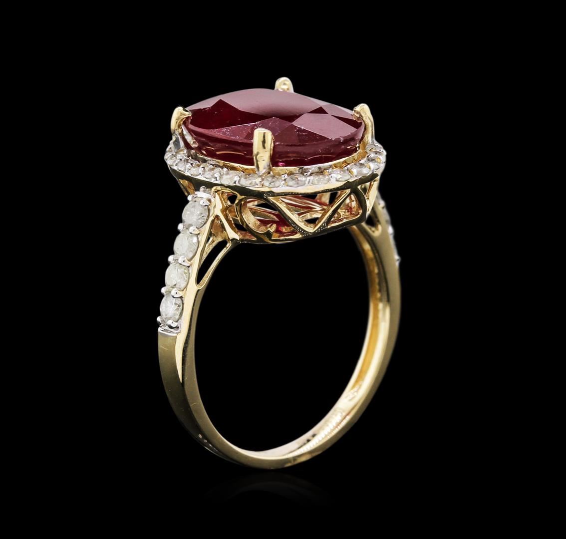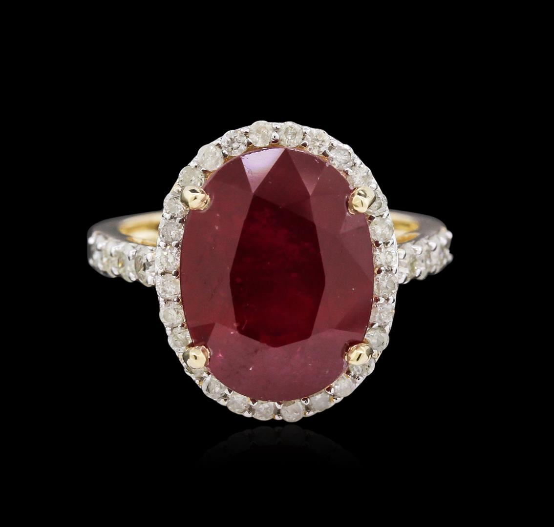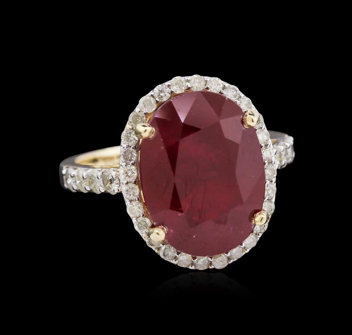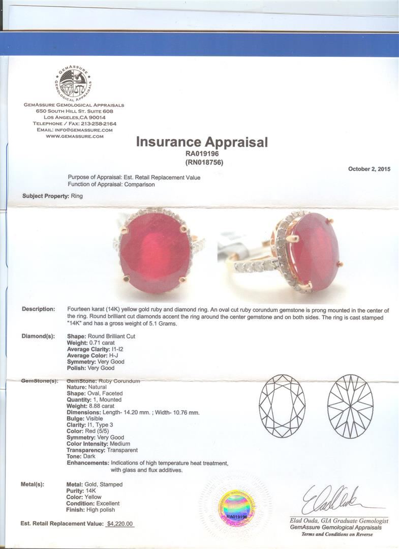 Fourteen karat (14K) yellow gold ruby and diamond ring. An oval cut ruby corundum gemstone is prong mounted in the center of the ring. Round brilliant cut diamonds accent the ring around the center gemstone. The ring is cast stamped "14K" and has a gross weight of 5.1 Grams. Diamond(s): Shape: Round Brilliant Cut. Weight: 0.71 carat. Average Clarity: I1-I2. Average Color: H-J. Symmetry: Very Good. Polish: Very Good. GemStone(s): Ruby Corundum. Nature: Natural. Shape: Oval, Faceted. Quantity: 1. Weight: 8.88 carat total. Dimensions: Length- 14.20 mm. ; Width 10.76 mm. Bulge: Visible. Clarity: I1, Type 3. Color: Red (5/5). Symmetry: Very Good. Color Intensity: Medium. Transparency: Transparent. Tone: Dark. Enhancements: Indications of high temperature heat treatment, with glass and flux additives. Metal(s): Metal: Gold, Stamped. Purity: 14K. Color: Yellow. Condition: Excellent. Finish: High polish. GGA Appraised at $4,220.00.