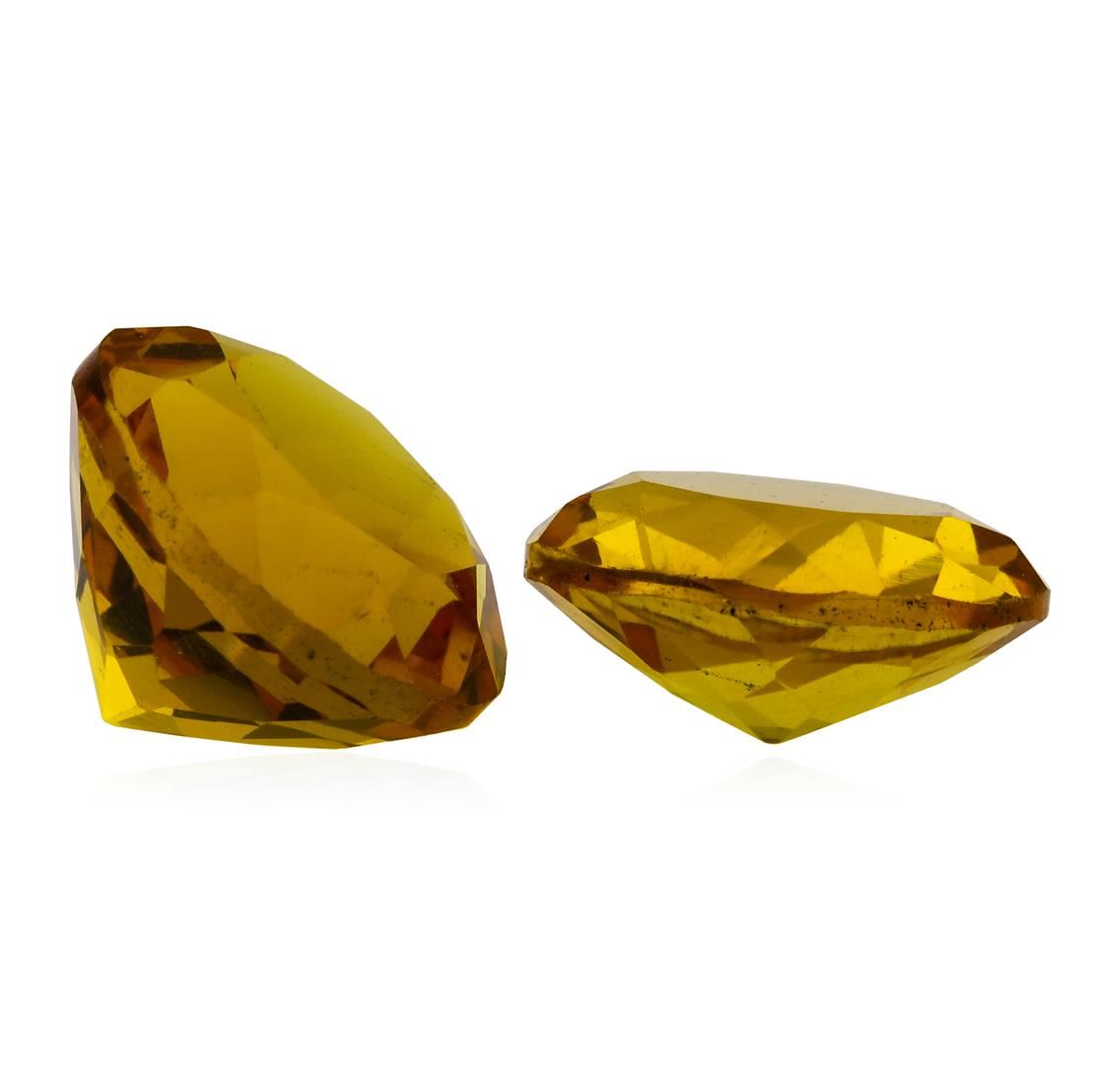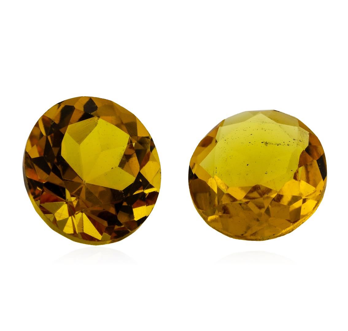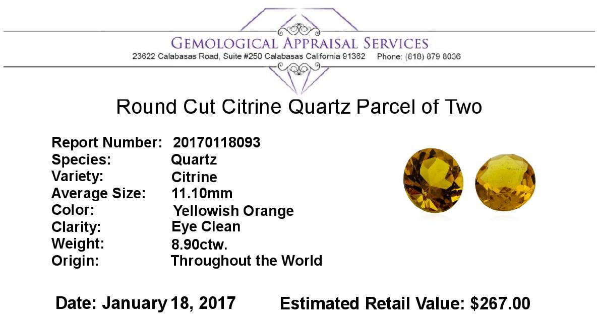 One natural round cut citrine quartz parcel of two with an exact weight of 8.90ctw., clarity is eye clean, yellowish orange. Gemological Appraisals Services estimates the retail value at $267 GAS Appraised.