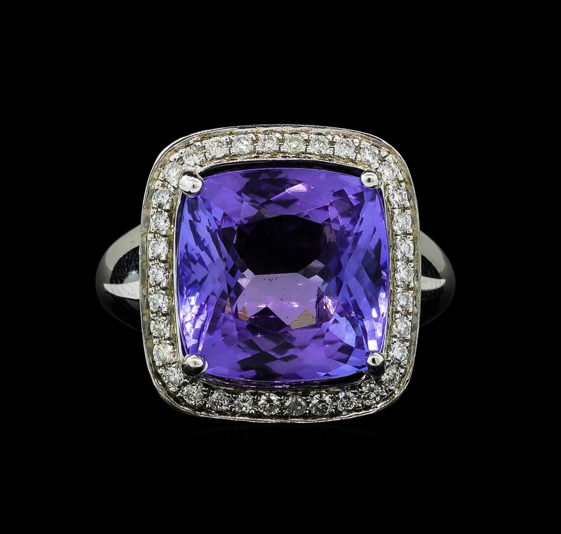 One electronically tested 14KT white gold lady's combination cast & assembled fashion ring with a tapered shank with a bright polish finish. The featured lady's ring has a shank measuring 4.23 millimeters wide. Identified with markings of '14K'. Condition is new, good workmanship. Containing: One prong set square cushion modified brilliant cut natural tanzanite, measuring 12.05 x 12.00 x 6.99mm, (depth est.) 12%. bulge factor, approximate weight of 8.90ct., clarity is eye clean, medium light, moderately strong, violet color, (GIA V 4/4), cut is very good. Transmitting light with no distortion, transparent. Colored gemstones are presumed to have been subjected to commonly used enhancement processes. Graded in the setting. Thirty-Four bead set round brilliant cut diamonds, measuring 1.30 - 1.20 x 0.78mm (depth est.) approximate total weight of 34 Stones = 0.26ct. Graded in the setting. Clarity SI-1 to I-1. Color: H - I Cut Good. Total Weight of Colored Stones 8.90ct.. Total Weight of Diamonds 0.26ct.. Total Weight of Ring 10.60gm GAS Appraised at $12,630.00.