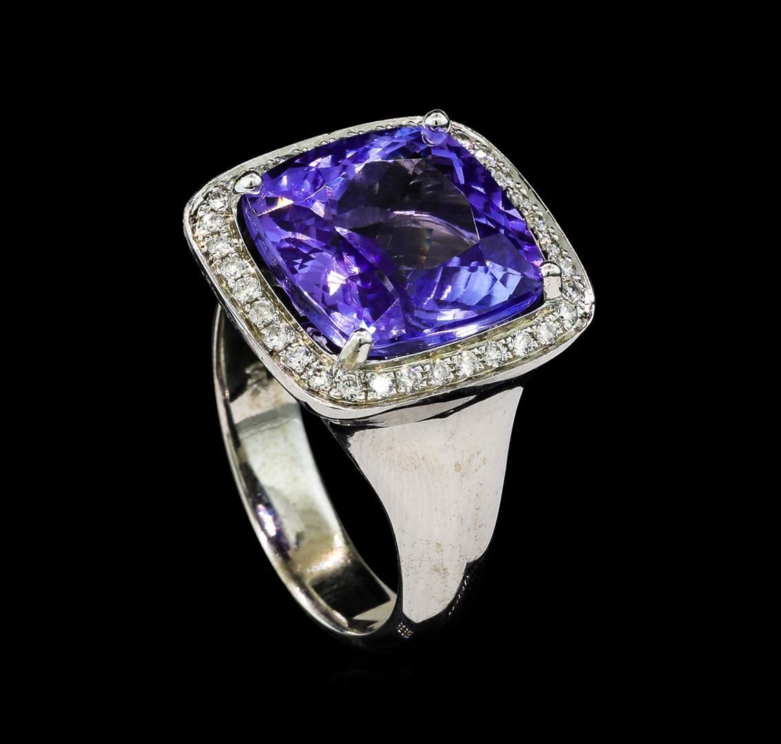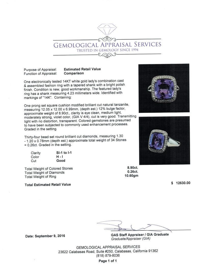 One electronically tested 14KT white gold lady's combination cast & assembled fashion ring with a tapered shank with a bright polish finish. The featured lady's ring has a shank measuring 4.23 millimeters wide. Identified with markings of '14K'. Condition is new, good workmanship. Containing: One prong set square cushion modified brilliant cut natural tanzanite, measuring 12.05 x 12.00 x 6.99mm, (depth est.) 12%. bulge factor, approximate weight of 8.90ct., clarity is eye clean, medium light, moderately strong, violet color, (GIA V 4/4), cut is very good. Transmitting light with no distortion, transparent. Colored gemstones are presumed to have been subjected to commonly used enhancement processes. Graded in the setting. Thirty-Four bead set round brilliant cut diamonds, measuring 1.30 - 1.20 x 0.78mm (depth est.) approximate total weight of 34 Stones = 0.26ct. Graded in the setting. Clarity SI-1 to I-1. Color: H - I Cut Good. Total Weight of Colored Stones 8.90ct.. Total Weight of Diamonds 0.26ct.. Total Weight of Ring 10.60gm GAS Appraised.