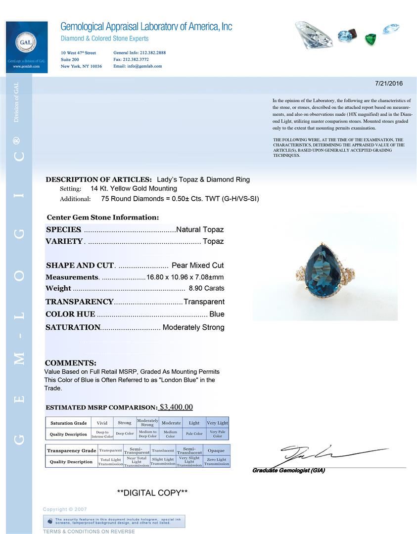 One Lady's Topaz and Diamond Ring. Setting: 14 Kt. Yellow Gold Mounting. Additional: 75 Round Diamonds = 0.50 Cts. TWT (G-H/VS-SI). Center Gem Stone Information: Species: Natural Topaz. Variety: Topaz. Shape and Cut: Pear Mixed Cut. Measurements: 16.80 x 10.96 x 7.08 mm. Weight: 8.90 Carats. Transparency: Transparent. Color Hue: Blue. Saturation: Moderately Strong. Total Weight: 3.21 grams.