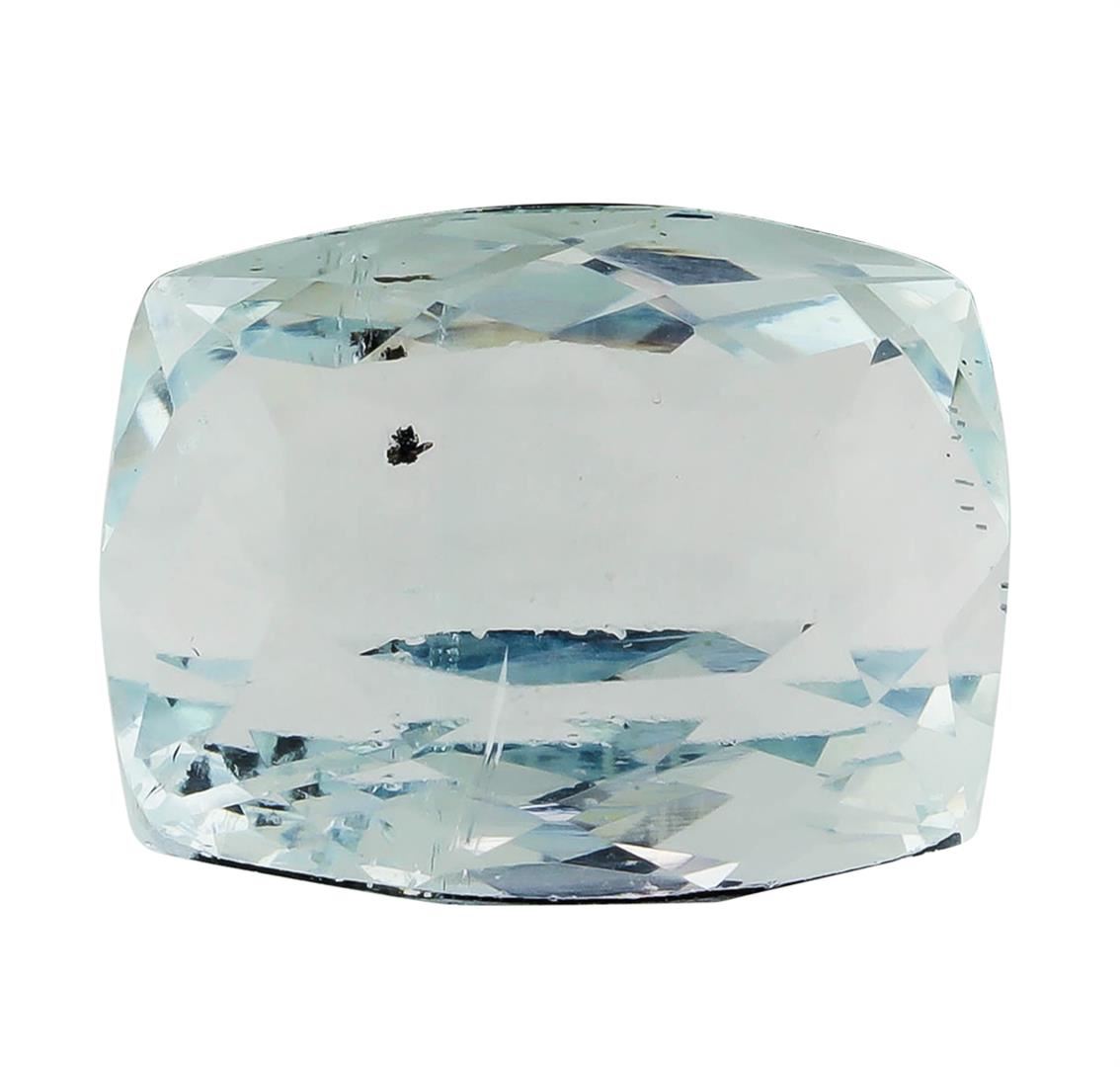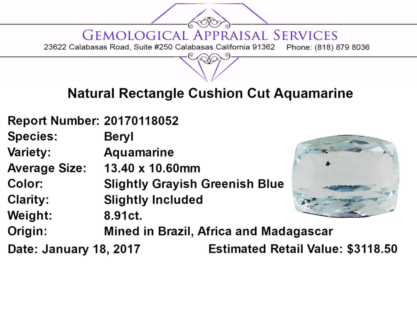 One natural rectangle cushion cut aquamarine with an exact weight of 8.91ct., clarity is slightly included, slightly grayish greenish blue. Gemological Appraisals Services estimates the retail value at $3118.5 GAS Appraised.