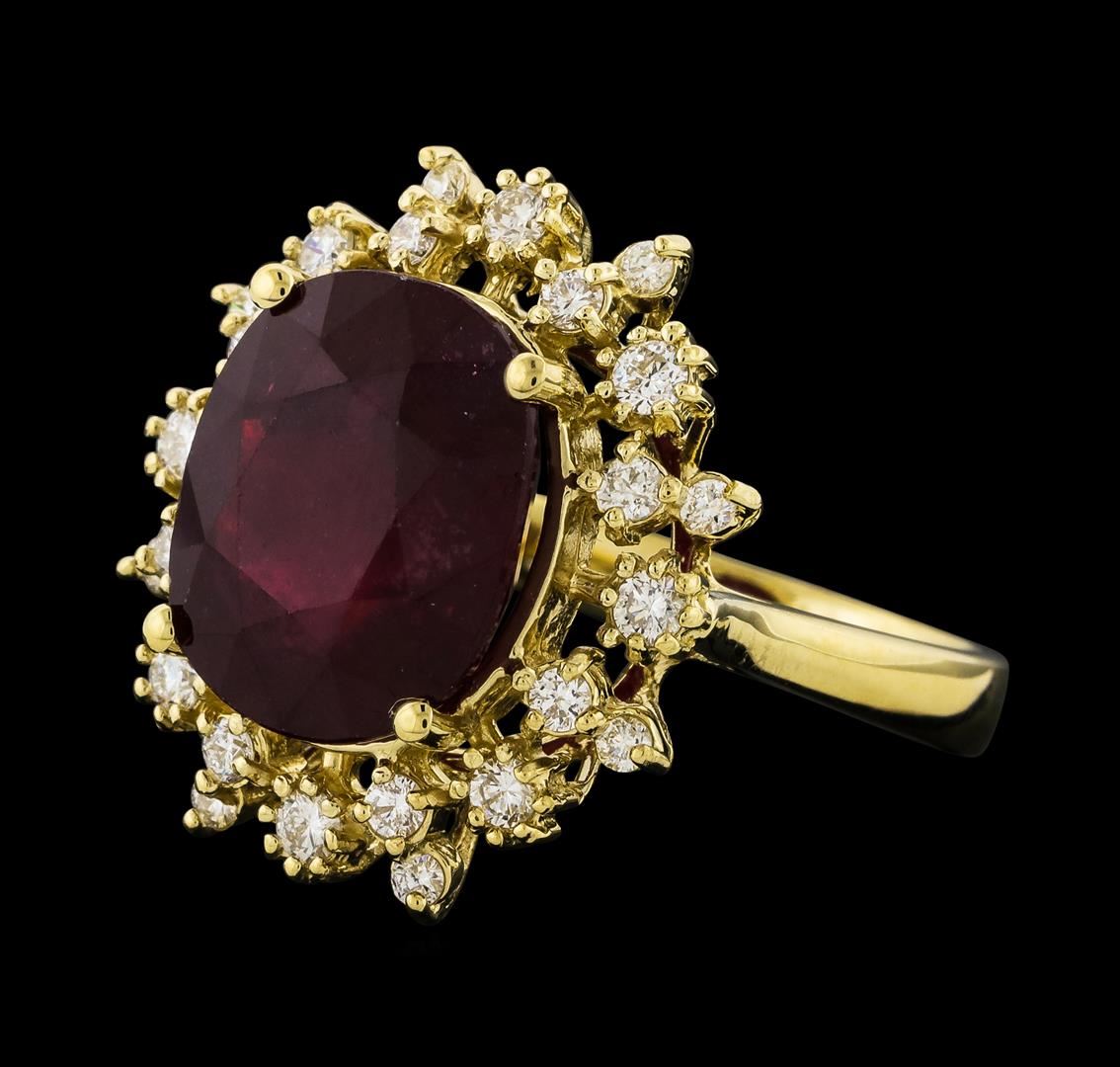One Ruby and Diamond Ring featuring: 14KT Yellow Gold with a total weight of 5.66 grams, Ruby with a total weight of 8.91ct, and 24 diamonds with a total weight of 0.58ctw.