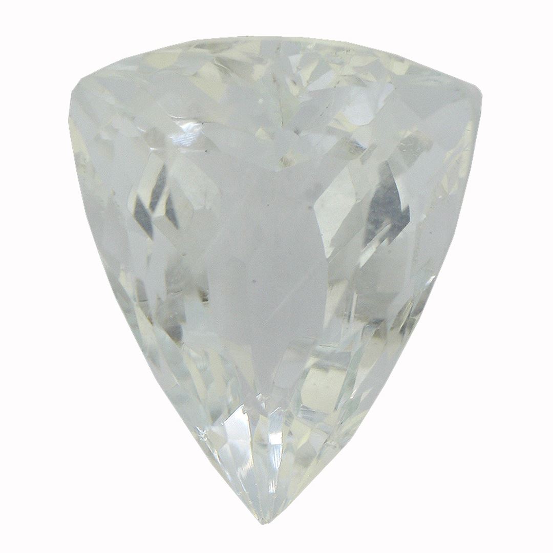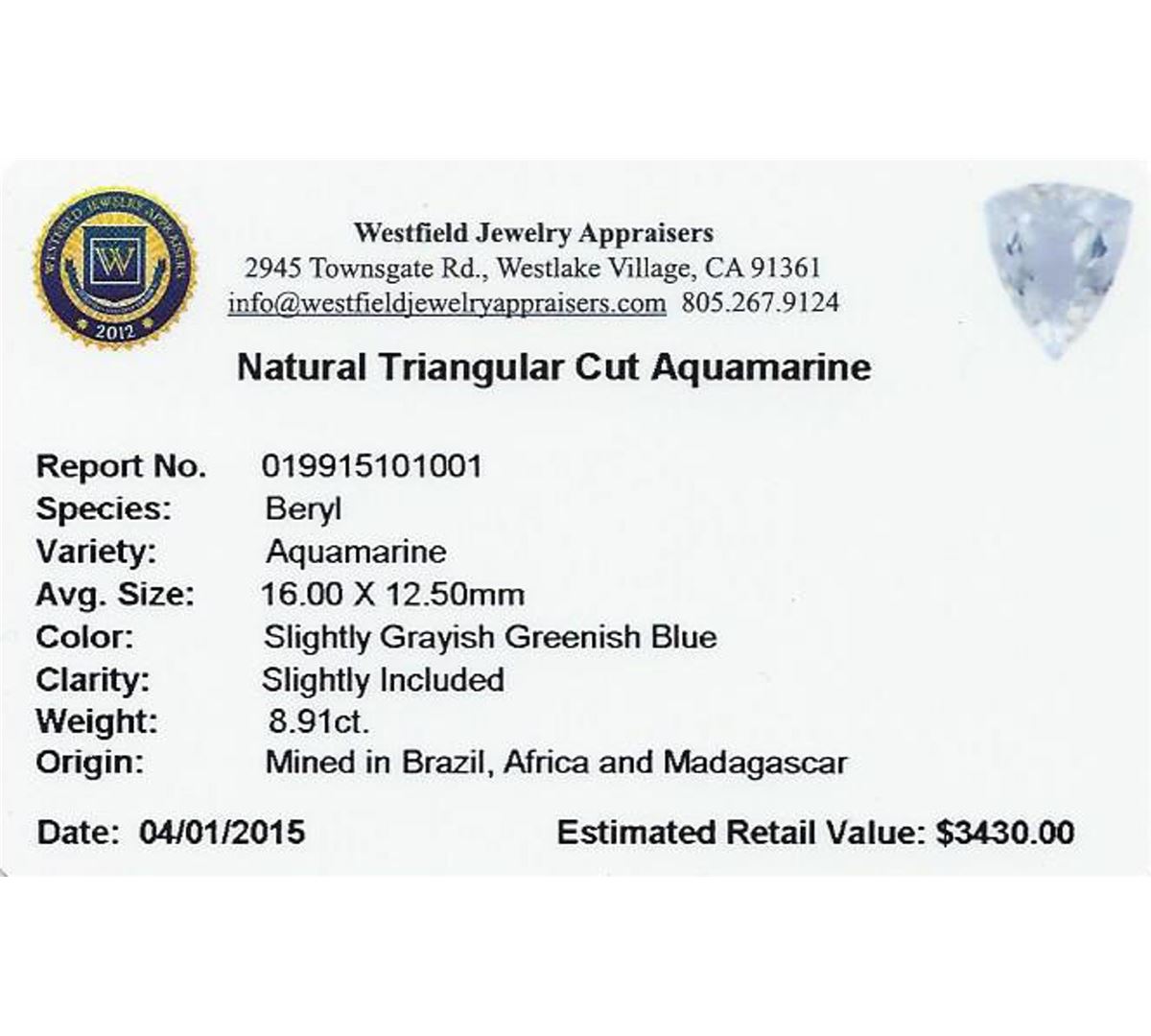 One triangle cut natural aquamarine exact weight 8.91ct., clarity is slightly included, type I, medium light, very slightly grayish, very slightly greenish blue color, (GIA vslgB 4/3), cut is good. Westfield Appraised at $3,430.00.