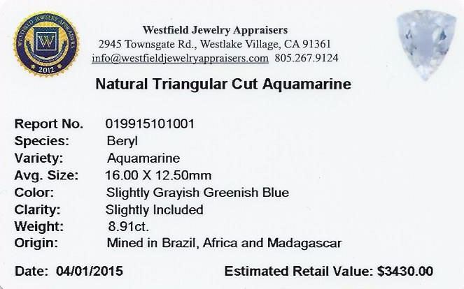 One triangle cut natural aquamarine exact weight 8.91ct., clarity is slightly included, type I, medium light, very slightly grayish, very slightly greenish blue color, (GIA vslgB 4/3), cut is good. Westfield Appraised at $3,430.00.