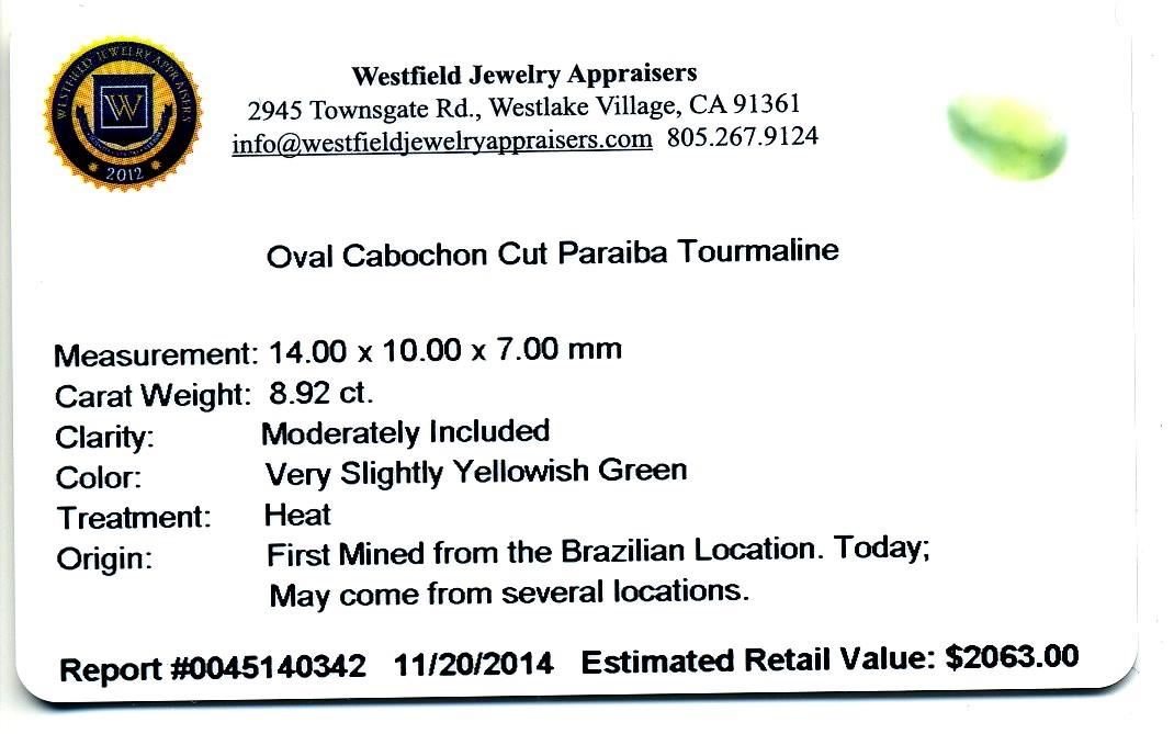 8.92ctw. Oval Cabochon Cut Paraiba Tourmaline. Westfield Appraised at $2,063.00.