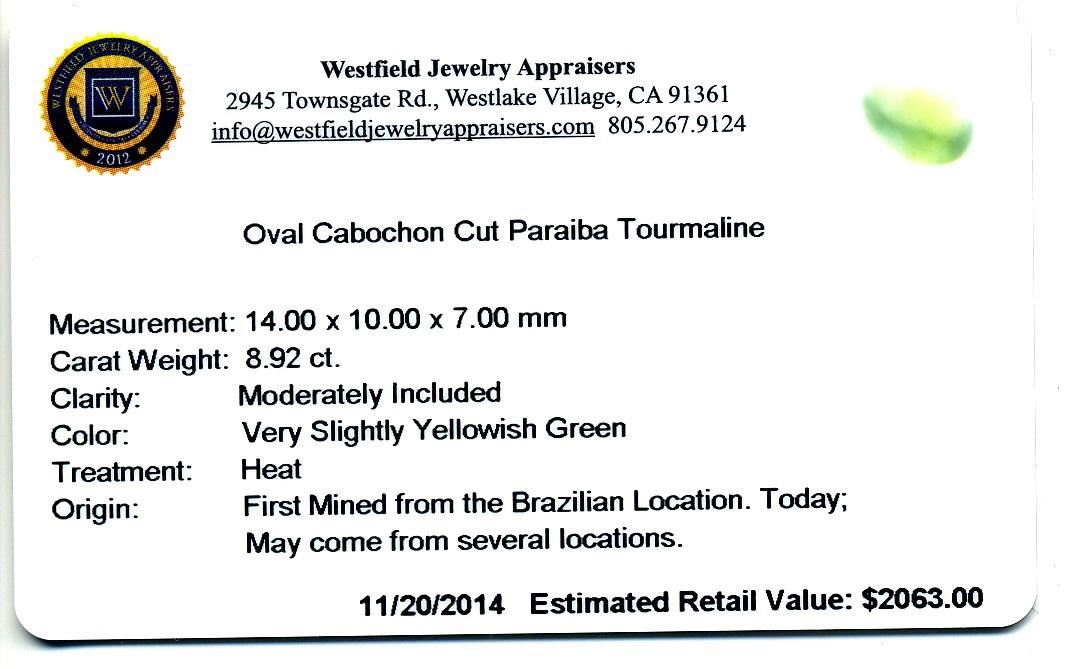 8.92ctw. Oval Cabochon Cut Paraiba Tourmaline. Westfield Appraised at $2,063.00.