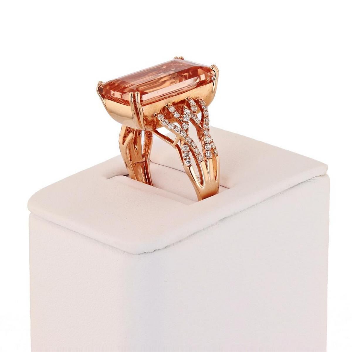 One electronically tested 14KT rose gold ladies cast morganite and diamond ring with a bright polish finish. Condition is new, good workmanship. The featured morganite is set within a rose gold basket supported by stylized diamond set shoulders, completed by a two millimeter wide band. Trademark is Orianne. Identified with markings of "14K". Containing: One prong set rectangular step cut natural morganite, measuring 16.90 x 11.00 x 7.00mm, approximate weight of 8.94ct., clarity is eye clean, type I, light, slightly brownish, red orange color, (GIA RO 3/2), cut is good. Transmitting light with no distortion, transparent. Graded in the setting. Sixty-six prong set round brilliant cut diamonds approximate total weight of 66 Stones = 0.35ct. Graded in the setting. Clarity SI-2 to I-2 Color F-H Total Weight of Colored Stones 8.94ct. Total Weight of Diamonds 0.35ct. Total Weight of Ring 6.81 gm