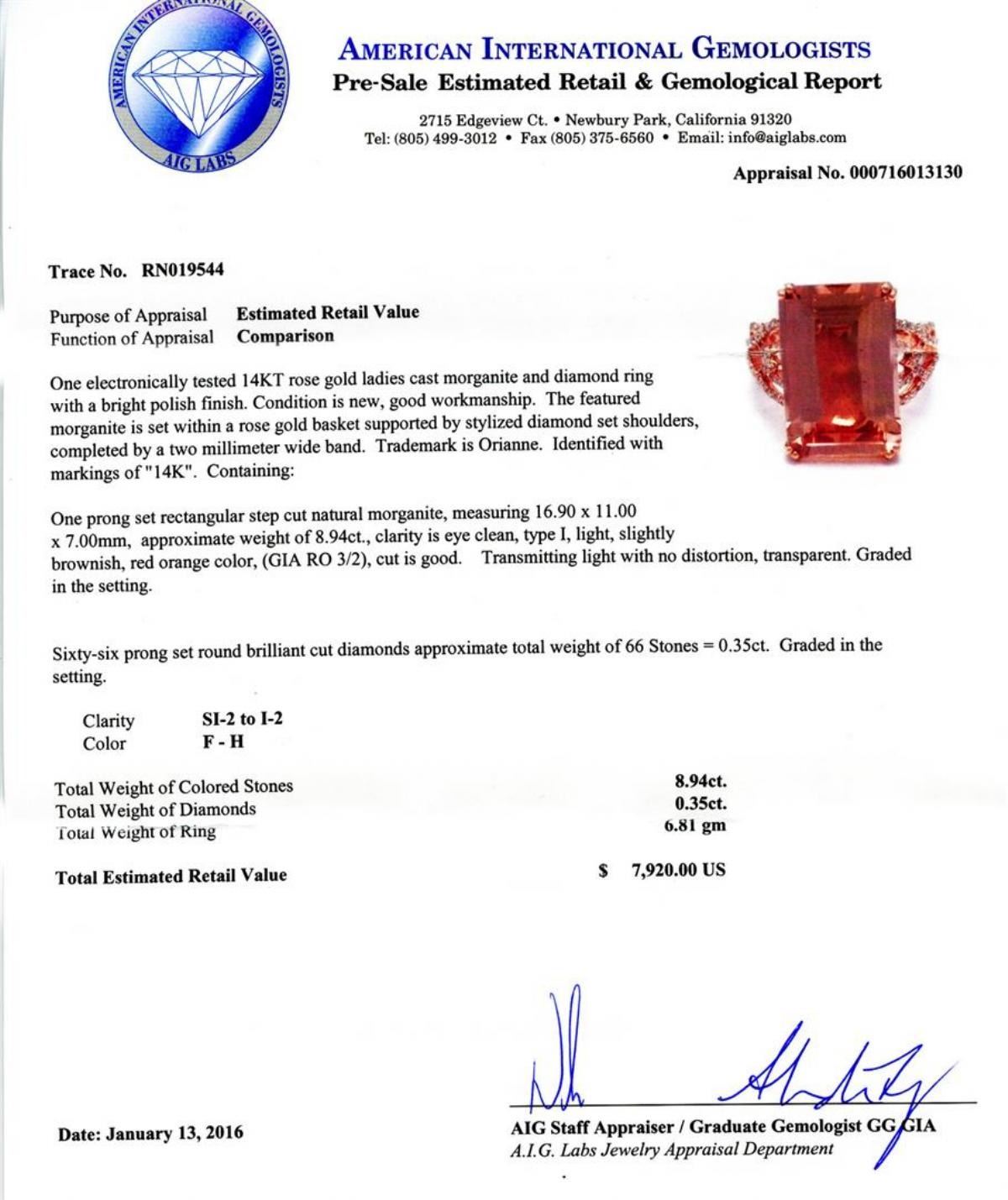 One electronically tested 14KT rose gold ladies cast morganite and diamond ring with a bright polish finish. Condition is new, good workmanship. The featured morganite is set within a rose gold basket supported by stylized diamond set shoulders, completed by a two millimeter wide band. Trademark is Orianne. Identified with markings of "14K". Containing: One prong set rectangular step cut natural morganite, measuring 16.90 x 11.00 x 7.00mm, approximate weight of 8.94ct., clarity is eye clean, type I, light, slightly brownish, red orange color, (GIA RO 3/2), cut is good. Transmitting light with no distortion, transparent. Graded in the setting. Sixty-six prong set round brilliant cut diamonds approximate total weight of 66 Stones = 0.35ct. Graded in the setting. Clarity SI-2 to I-2 Color F-H Total Weight of Colored Stones 8.94ct. Total Weight of Diamonds 0.35ct. Total Weight of Ring 6.81 gm