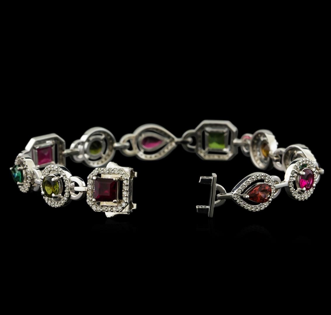 One electronically tested 14KT white gold lady's combination cast & assembled fashion bracelet with a double plunger clasp with a bright polish finish. The featured lady's bracelet measures approximately 7.5 inches in length. Identified with markings of "K14". Condition is new, good workmanship. Containing: Four prong set pear modified brilliant cut natural multi-color tourmalines, measuring 7.35 x 4.95 x 3.28mm, 15%. bulge factor, approximate total weight of 3.40ct., clarity is eye clean, cut is good. The featured tourmalines range in color from green to pink to orange. Transmitting light with no distortion, transparent. Colored gemstones are presumed to have been subjected to commonly used enhancement processes. Graded in the setting. Four prong set round modified brilliant cut natural multi-color tourmalines, measuring 5.80 - 5.45 x 3.30 mm, approximate total weight of 2.72ct., clarity is slightly included, cut is good. The featured tourmalines range in color from dark green to bluish green to pink to orange. Transmitting light with a minimum of distortion, transparent. Colored gemstones are presumed to have been subjected to commonly used enhancement processes. Graded in the setting. Three prong set square standard step cut natural multi-color tourmalines, measuring 5.70 x 5.20 x 3.60mm, 15%. bulge factor, approximate total weight of 2.82ct., clarity is slightly included, cut is good. The featured tourmalines range in color from green to pink to orangy red. Transmitting light with a minimum of distortion, transparent. Colored gemstones are presumed to have been subjected to commonly used enhancement processes. Graded in the setting. Two Hundred Forty-Eight prong set round brilliant cut diamonds, measuring 1.20 - 1.15 x 0.73mm (depth est.) approximate total weight of 248 Stones = 1.52ct. Graded in the setting. Clarity: SI-1 to SI-2. Color: H - I. Cut Good. Total Weight of Colored Stones 8.94ct. Total Weight of Diamonds 1.52ct. Total Weight of Bracelet 18.40gm. GAS Appraised at $9,865.00.