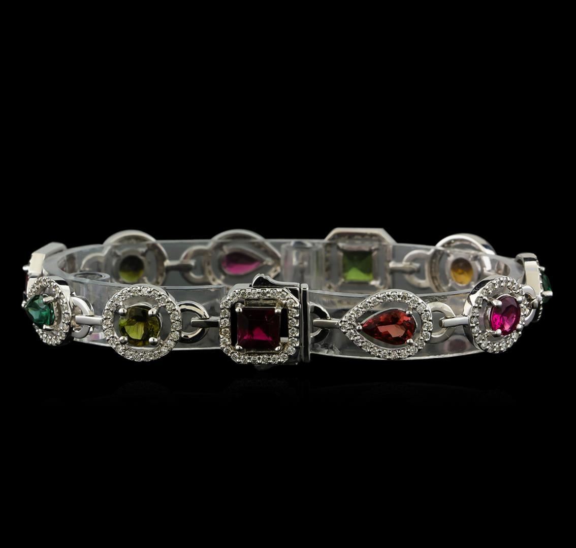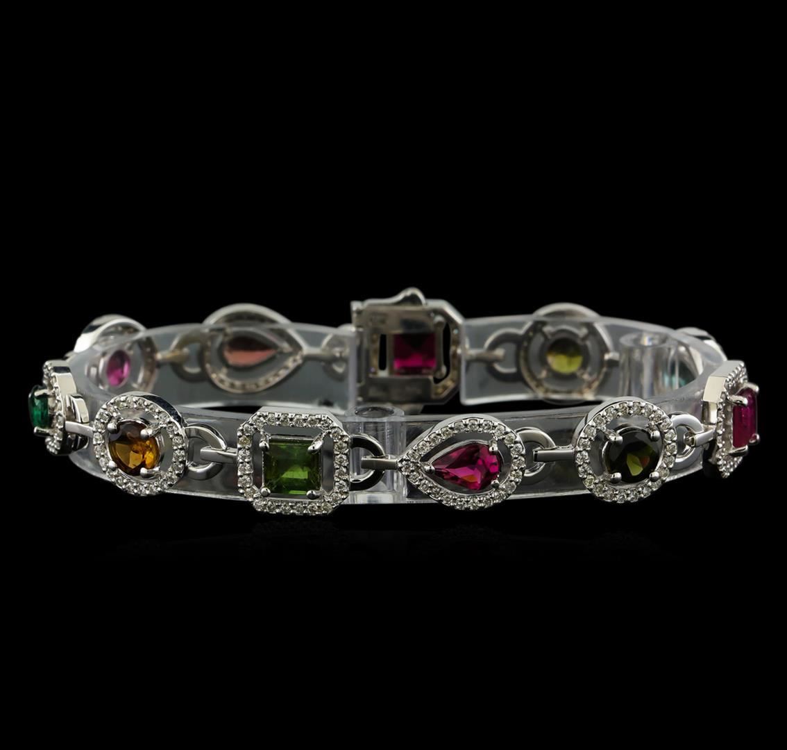 One electronically tested 14KT white gold lady's combination cast & assembled fashion bracelet with a double plunger clasp with a bright polish finish. The featured lady's bracelet measures approximately 7.5 inches in length. Identified with markings of "K14". Condition is new, good workmanship. Containing: Four prong set pear modified brilliant cut natural multi-color tourmalines, measuring 7.35 x 4.95 x 3.28mm, 15%. bulge factor, approximate total weight of 3.40ct., clarity is eye clean, cut is good. The featured tourmalines range in color from green to pink to orange. Transmitting light with no distortion, transparent. Colored gemstones are presumed to have been subjected to commonly used enhancement processes. Graded in the setting. Four prong set round modified brilliant cut natural multi-color tourmalines, measuring 5.80 - 5.45 x 3.30 mm, approximate total weight of 2.72ct., clarity is slightly included, cut is good. The featured tourmalines range in color from dark green to bluish green to pink to orange. Transmitting light with a minimum of distortion, transparent. Colored gemstones are presumed to have been subjected to commonly used enhancement processes. Graded in the setting. Three prong set square standard step cut natural multi-color tourmalines, measuring 5.70 x 5.20 x 3.60mm, 15%. bulge factor, approximate total weight of 2.82ct., clarity is slightly included, cut is good. The featured tourmalines range in color from green to pink to orangy red. Transmitting light with a minimum of distortion, transparent. Colored gemstones are presumed to have been subjected to commonly used enhancement processes. Graded in the setting. Two Hundred Forty-Eight prong set round brilliant cut diamonds, measuring 1.20 - 1.15 x 0.73mm (depth est.) approximate total weight of 248 Stones = 1.52ct. Graded in the setting. Clarity: SI-1 to SI-2. Color: H - I. Cut Good. Total Weight of Colored Stones 8.94ct. Total Weight of Diamonds 1.52ct. Total Weight of Bracelet 18.40gm. GAS Appraised.