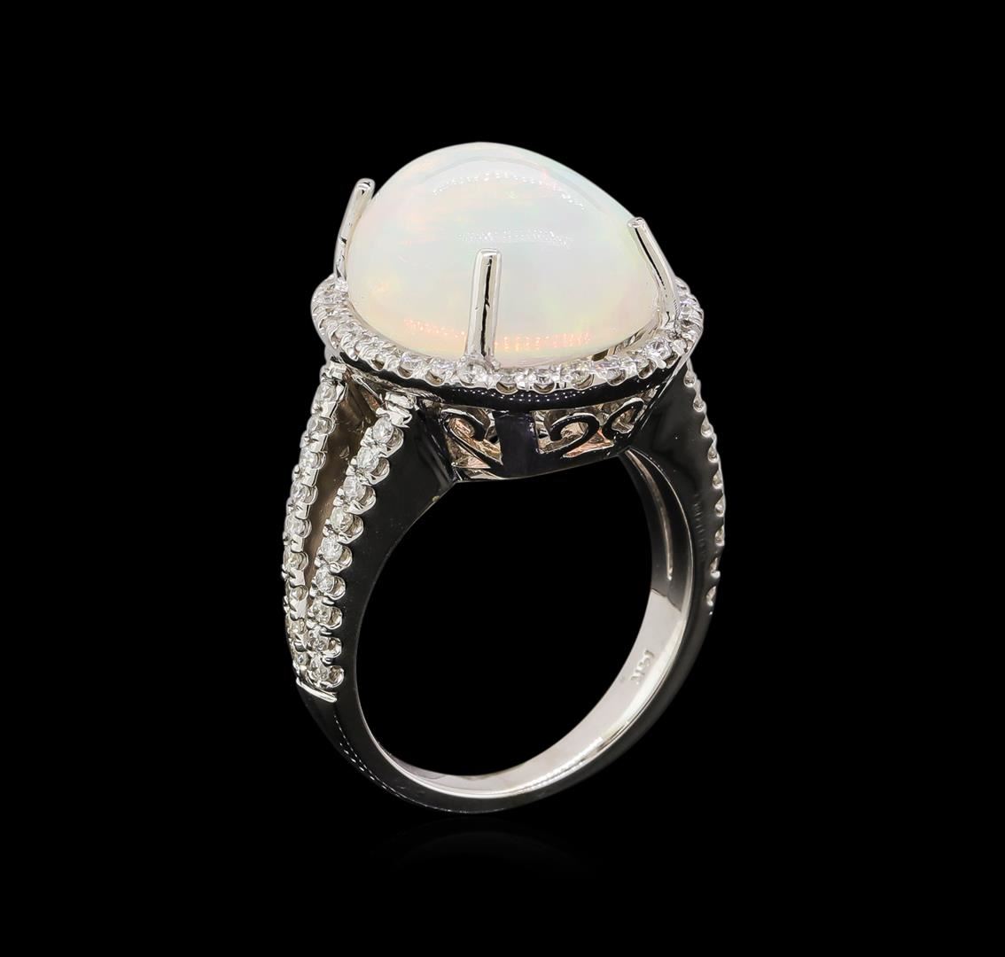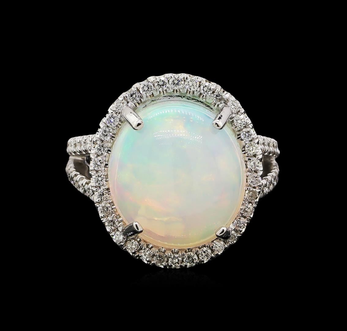 One electronically tested 14KT white gold lady's cast fashion ring with a split shank halo with a bright polish finish. The featured lady's ring has a shank measuring 2.80 millimeters wide. Identified with markings of '14K'. Condition is new, good workmanship. Containing: One crystal opal that is cut in a oval shaped cabochon and is prong set, measuring 14.86 mm long x 13.82 mm wide, and 9.44 mm thick and the approximate weight is 8.95 carats. The opal has a very bright, red multicolor play of color (fire) in a rolling flashfire pattern; a high dome; a good cut; no inclusions; consistent in its brightness and pattern; and is not directional. Graded in the setting. Seventy prong set round brilliant cut diamonds, measuring 1.45 - 1.35 x 0.87mm (depth est.) approximate total weight of 70 Stones = 0.74ct. Graded in the setting. Clarity SI-1 to I-1. Color: H - I Cut Good. Total Weight of Diamonds 0.74ct.. Total Weight of Opals 8.95ct.. Total Weight of Ring 11.60gm. GAS Appraised at $9,270.00.