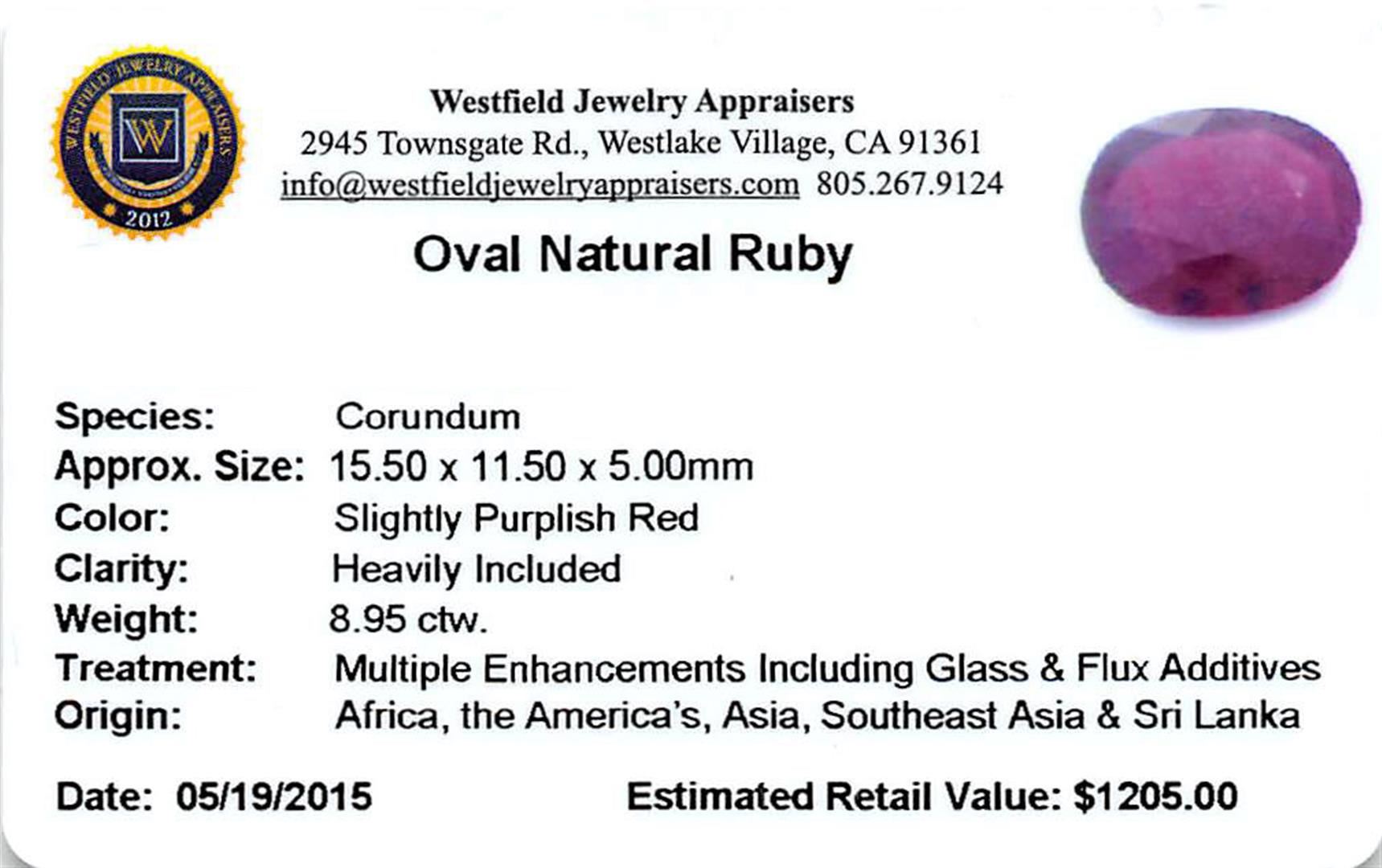 One oval mixed cut natural ruby, measuring 15.50 x 11.50 x 5.00mm, exact weight 8.95ct., clarity is heavily included, type II, dark, very slightly brownish, slightly purplish red color, (GIA slpR 7/3), cut is good. Transmitting light somewhat diffusely, transparent to translucent. Naturally occurring internal & external characteristics are present. Indications of laboratory high temperature heat treatment, with glass & flux additives. Ruby has a low tolerance to rhodium plating, repolishing the surface, & ultrasonic cleaning. Westfield Appraised.