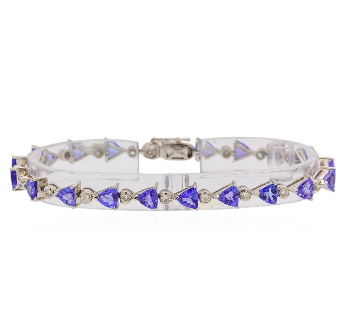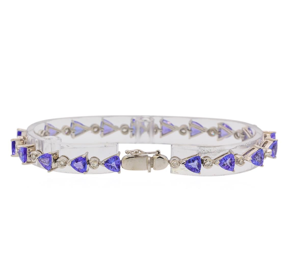 One electronically tested 14KT white gold lady's combination cast & assembled fashion bracelet with a tongue clasp with foldover safety with a bright polish finish. The featured lady's bracelet measures 7.5 inches in length. Identified with markings of '14K'. Condition is new, good workmanship. Containing: Nineteen prong set triangle modified brilliant cut natural tanzanites, measuring 5.30 x 5.25 x 2.76mm, (depth est.) approximate total weight of 8.96ct., clarity is eye clean, medium, moderately strong, bluish violet color, (GIA bV 5/4), cut is good. Transmitting light with no distortion, transparent. Colored gemstones are presumed to have been subjected to commonly used enhancement processes. Graded in the setting. Nineteen prong set round brilliant cut diamonds, measuring 2.55 - 2.45 x 1.53mm (depth est.) approximate total weight of 19 Stones = 1.10ct. Graded in the setting. Clarity VS-2 to SI-1. Color: H - I Cut Good. Total Weight of Colored Stones 8.96ct.. Total Weight of Diamonds 1.10ct.. Total Weight of Bracelet 12.20gm. GAS Appraised at $11,105.00.