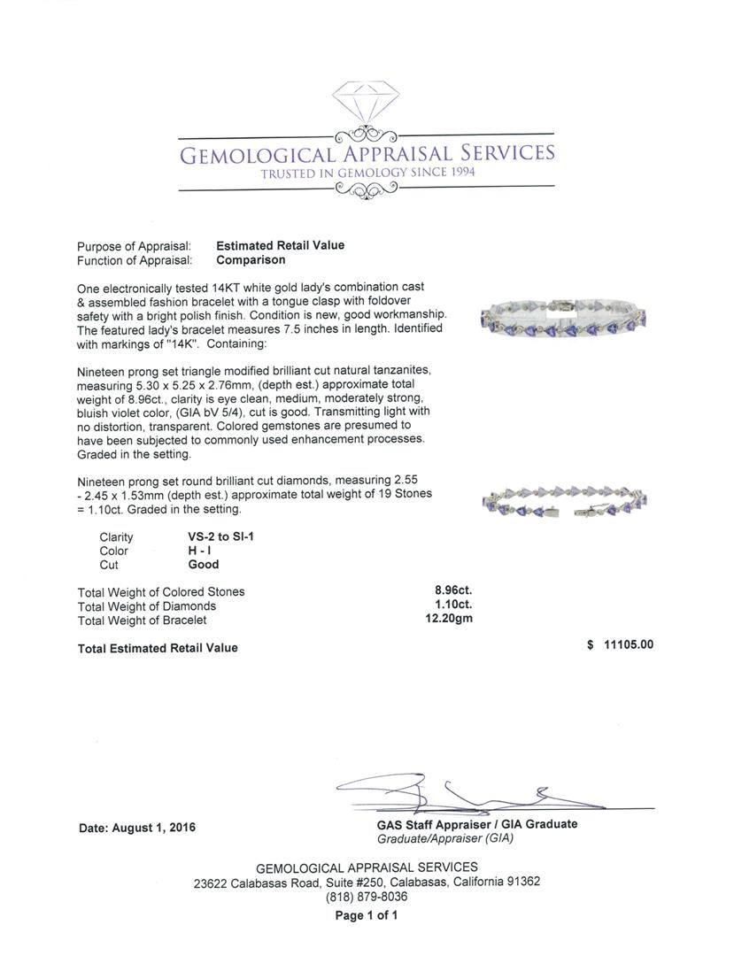 One electronically tested 14KT white gold lady's combination cast & assembled fashion bracelet with a tongue clasp with foldover safety with a bright polish finish. The featured lady's bracelet measures 7.5 inches in length. Identified with markings of '14K'. Condition is new, good workmanship. Containing: Nineteen prong set triangle modified brilliant cut natural tanzanites, measuring 5.30 x 5.25 x 2.76mm, (depth est.) approximate total weight of 8.96ct., clarity is eye clean, medium, moderately strong, bluish violet color, (GIA bV 5/4), cut is good. Transmitting light with no distortion, transparent. Colored gemstones are presumed to have been subjected to commonly used enhancement processes. Graded in the setting. Nineteen prong set round brilliant cut diamonds, measuring 2.55 - 2.45 x 1.53mm (depth est.) approximate total weight of 19 Stones = 1.10ct. Graded in the setting. Clarity VS-2 to SI-1. Color: H - I Cut Good. Total Weight of Colored Stones 8.96ct.. Total Weight of Diamonds 1.10ct.. Total Weight of Bracelet 12.20gm. GAS Appraised at $11,105.00.