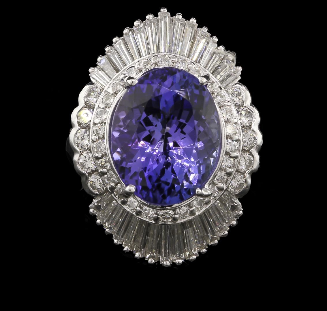 One electronically tested platinum ladies cast tanzanite and diamond ring with a bright polish finish. Identified with markings of "PT 900". Condition is new. Containing: One prong set oval modified brilliant cut natural tanzanite, measuring 13.66 x 10.76 x 8.67mm, approximate weight of 8.96ct., clarity is eye clean, type I, medium light, very slightly grayish, violet color, (GIA V 4/3), cut is good. Thirty channel set baguette cut diamonds, measuring from 3.00 x 1.50 x 1.28mm (depth est.) to 5.00 x 1.50 x 1.28mm (depth est.) approximate. Total Weight of 30 Stones = 2.11ct. Clarity: VS-2. Color: H - I, Cut is Good. Ten half bezel set round brilliant cut diamonds, measuring 2.00 - 2.00 x 1.20mm (depth est.) approximate. Total Weight of 10 Stones = 0.29ct. Clarity: VS-2. Color: H - I, Cut is Good. Twenty-Six prong set round brilliant cut diamonds, measuring 1.30 - 1.30 x 0.78mm (depth est.) approximate. Total Weight of 26 Stones = 0.21ct. Clarity: VS-2 to SI-1. Color: I - J, Cut is Good. Colored gemstones are presumed to have been subjected to commonly used enhancement processes. All diamonds and colored gemstones are graded in the mounting, unless otherwise stated. Total Weight of Colored Stones 8.96ct. Total Weight of Diamonds 2.61ct. Total Weight of Ring 15.80 grams. GGL Appraised at $11,945.00.