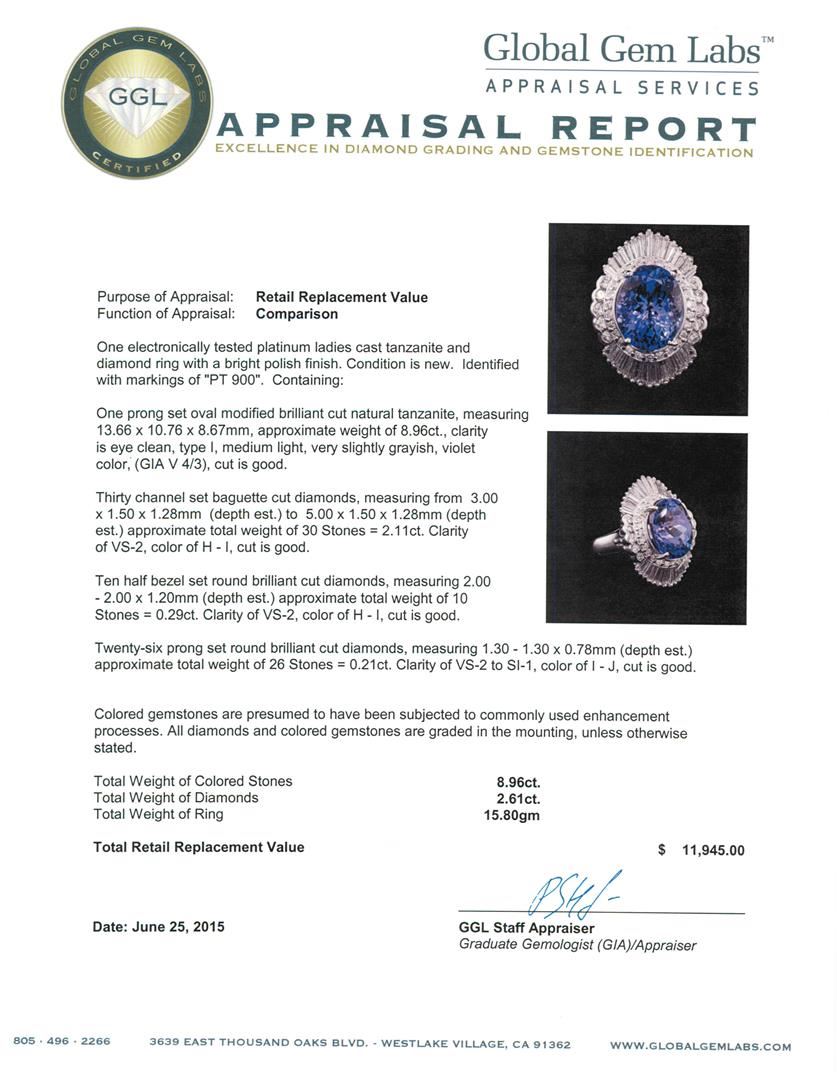 One electronically tested platinum ladies cast tanzanite and diamond ring with a bright polish finish. Identified with markings of "PT 900". Condition is new. Containing: One prong set oval modified brilliant cut natural tanzanite, measuring 13.66 x 10.76 x 8.67mm, approximate weight of 8.96ct., clarity is eye clean, type I, medium light, very slightly grayish, violet color, (GIA V 4/3), cut is good. Thirty channel set baguette cut diamonds, measuring from 3.00 x 1.50 x 1.28mm (depth est.) to 5.00 x 1.50 x 1.28mm (depth est.) approximate. Total Weight of 30 Stones = 2.11ct. Clarity: VS-2. Color: H - I, Cut is Good. Ten half bezel set round brilliant cut diamonds, measuring 2.00 - 2.00 x 1.20mm (depth est.) approximate. Total Weight of 10 Stones = 0.29ct. Clarity: VS-2. Color: H - I, Cut is Good. Twenty-Six prong set round brilliant cut diamonds, measuring 1.30 - 1.30 x 0.78mm (depth est.) approximate. Total Weight of 26 Stones = 0.21ct. Clarity: VS-2 to SI-1. Color: I - J, Cut is Good. Colored gemstones are presumed to have been subjected to commonly used enhancement processes. All diamonds and colored gemstones are graded in the mounting, unless otherwise stated. Total Weight of Colored Stones 8.96ct. Total Weight of Diamonds 2.61ct. Total Weight of Ring 15.80 grams. GGL Appraised at $11,945.00.