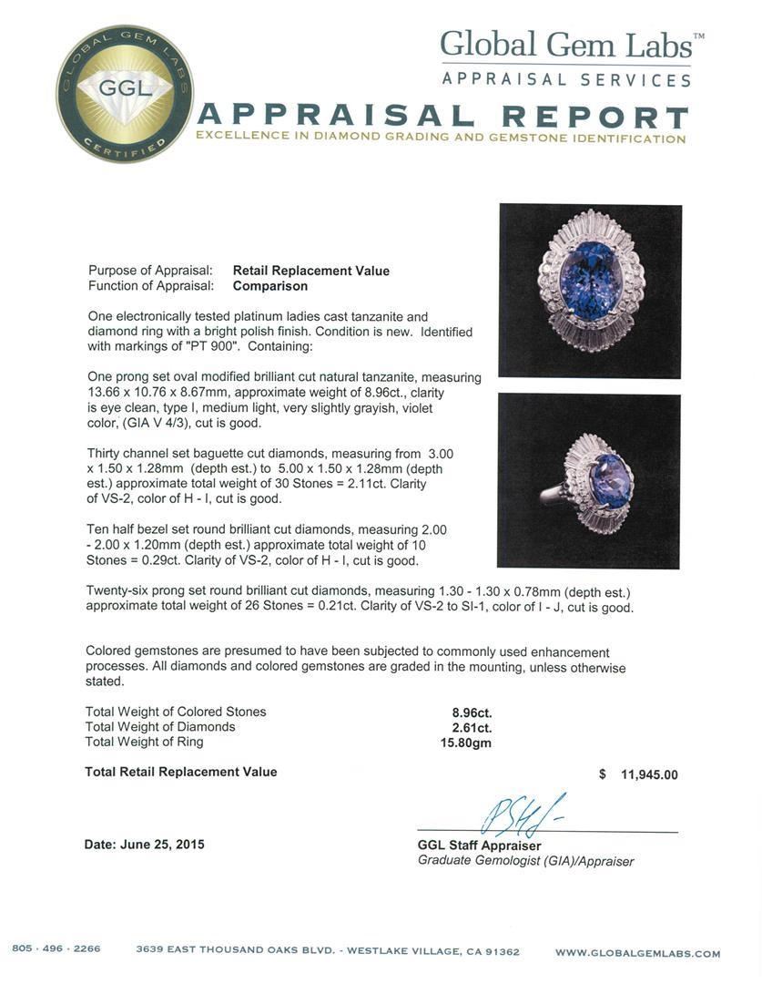 One electronically tested platinum ladies cast tanzanite and diamond ring with a bright polish finish. Identified with markings of "PT 900". Condition is new. Containing: One prong set oval modified brilliant cut natural tanzanite, measuring 13.66 x 10.76 x 8.67mm, approximate weight of 8.96ct., clarity is eye clean, type I, medium light, very slightly grayish, violet color, (GIA V 4/3), cut is good. Thirty channel set baguette cut diamonds, measuring from 3.00 x 1.50 x 1.28mm (depth est.) to 5.00 x 1.50 x 1.28mm (depth est.) approximate. Total Weight of 30 Stones = 2.11ct. Clarity: VS-2. Color: H - I, Cut is Good. Ten half bezel set round brilliant cut diamonds, measuring 2.00 - 2.00 x 1.20mm (depth est.) approximate. Total Weight of 10 Stones = 0.29ct. Clarity: VS-2. Color: H - I, Cut is Good. Twenty-Six prong set round brilliant cut diamonds, measuring 1.30 - 1.30 x 0.78mm (depth est.) approximate. Total Weight of 26 Stones = 0.21ct. Clarity: VS-2 to SI-1. Color: I - J, Cut is Good. Colored gemstones are presumed to have been subjected to commonly used enhancement processes. All diamonds and colored gemstones are graded in the mounting, unless otherwise stated. Total Weight of Colored Stones 8.96ct. Total Weight of Diamonds 2.61ct. Total Weight of Ring 15.80 grams. GGL Appraised.
