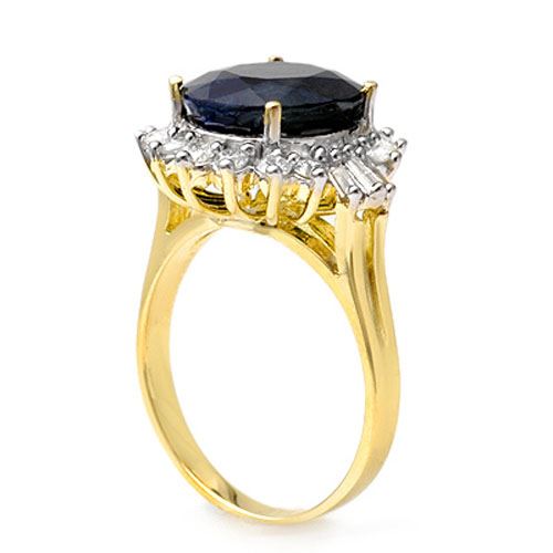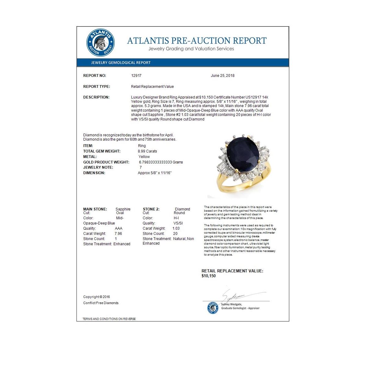 REF-141A8X -12917 ---- 8.99 CTW Blue Sapphire & Diamond Ring 14K Yellow Gold ---- Luxury Designer Brand Ring Appraised at $10,150 Certificate Number US12917 14k Yellow gold, Ring Size is 7, Ring measuring approx. 5/8" x 11/16" , weighing in total approx. 5.3 grams. Made in the USA and is stamped 14k, Main stone 7.96 carat total weight containing 1 pieces of Mid-Opaque-Deep Blue color with AAA quality Oval shape cut Sapphire , Stone #2 1.03 carat total weight containing 20 pieces of H-I color with VS/SI quality Round shape cut Diamond