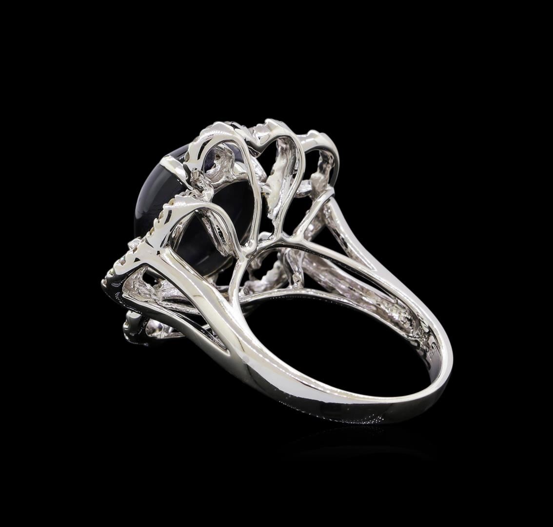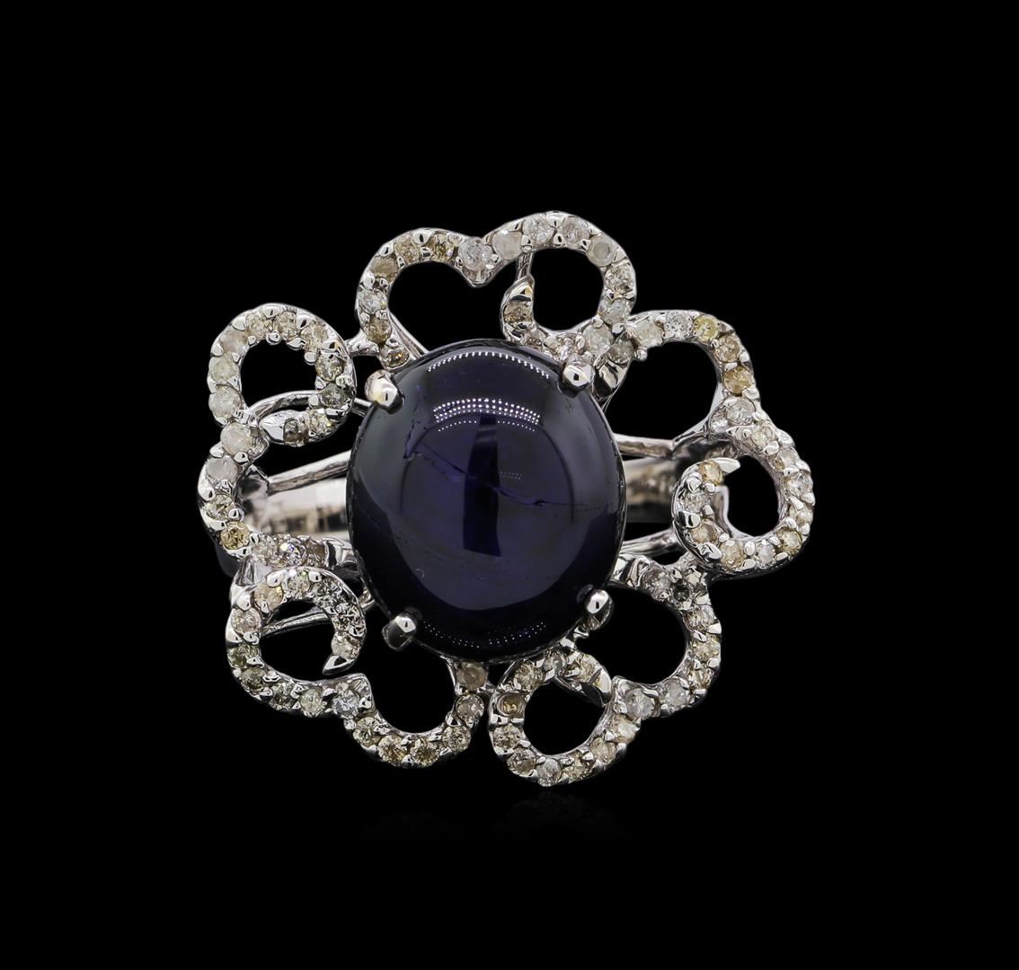 One electronically tested 18KT white gold ladies cast star sapphire and diamond ring with a bright polish finish. The featured star sapphire is set within a stylized diamond set floral bezel, completed by a two and one-half millimeter wide band. Identified with markings of "18K". Condition is new, good workmanship. Containing: One prong set oval cabochon cut natural blue star sapphire approximate weight of 8.99ct., medium dark, very slightly grayish, violetish blue color, (GIA vB 6/3), cut is good. This stone has a complete six ray star with strong intensity and good movement. Transmitting light very diffusely, opaque. Naturally occurring internal & external characteristics are present. Indications of laboratory high temperature diffusion treatment. Graded in the setting. Eighty-Five prong set round brilliant cut diamonds approximate total weight of 85 Stones = 0.60ct. Graded in the setting. Clarity: I-1 to I-2. Color: I - K. Total Weight of Colored Stones 8.99ct. Total Weight of Diamonds 0.60ct. Total Weight of Ring 9.57gm. AIG Appraised at $5,725.00.