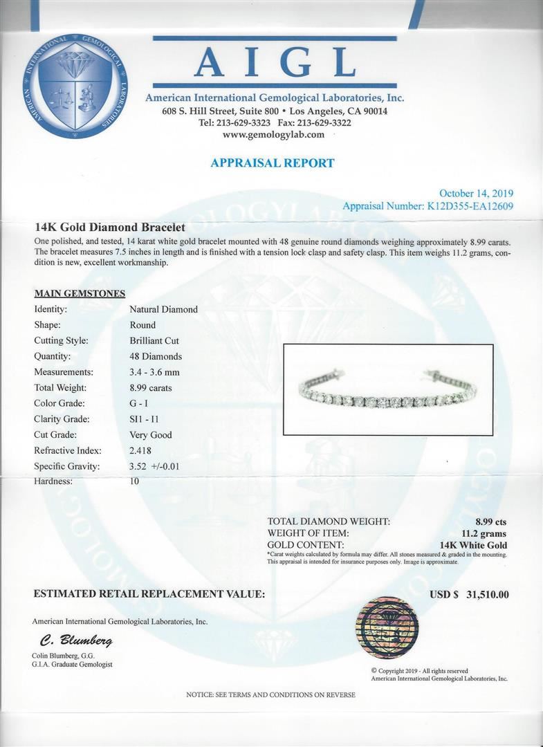 One 8.99ctw Diamond Bracelet - 14KT White Gold. AIG certified. See Appraisal for more details. AIG Appraised.