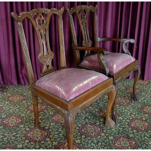 YOU ARE BIDDING ON A SET OF 8 CHAIRS, 2 ARMS AND 6 SIDES... JUST WHAT YOU'VE BEEN LOOKING FOR... FABRIC WILL MAY VARY... TERRIFIC FORM AND SHAPE... FABULOUS ANTIQUE STYLE WAVERLY UPHOLSTERY... EXQUISITE PIERCED BACKS WITH CUSHIONED SEATS... WHAT A GORGEOUS SET OF 8 FABULOUS VICTORIAN ORNATE CHIPPENDALE DINING CHAIRS... This set is hand crafted in what is considered a lost art form. The aged walnut has darkened into a full-bodied chestnut brown, hand rubbed in a smooth bees wax finish. This SET OF 8 FABULOUS VICTORIAN ORNATE CHIPPENDALE DINING CHAIRS are sure to become a highly sought after investment, to insure ownership of this quality set.