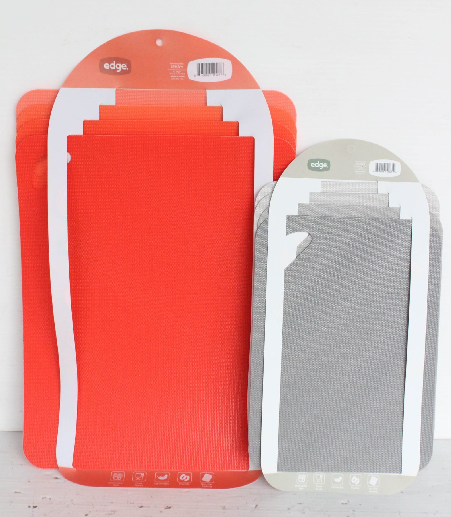 2 DIFFERENT SIZES AND VARIOUS SHADES OF 2 COLOURS: FOUR 15" X 12", FOUR 11" X 8". NON-SLIP, LIGHTWEIGHT AND SEMI-REIGID FLEXIBILITY, NON-SLIP BACKING. SHADES OF SALMON AND GREY.