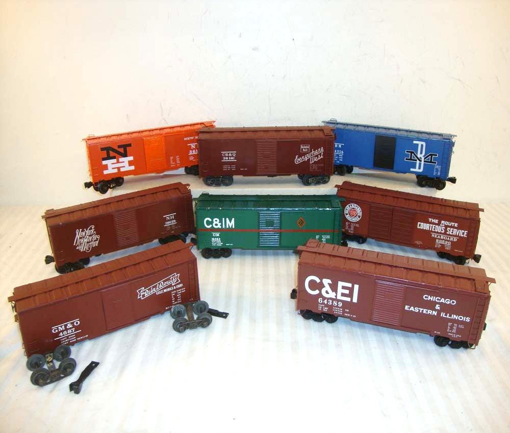 8 vintage Athearn O gauge box cars in various roadnames. Trucks and couplers must be reattached on one car.