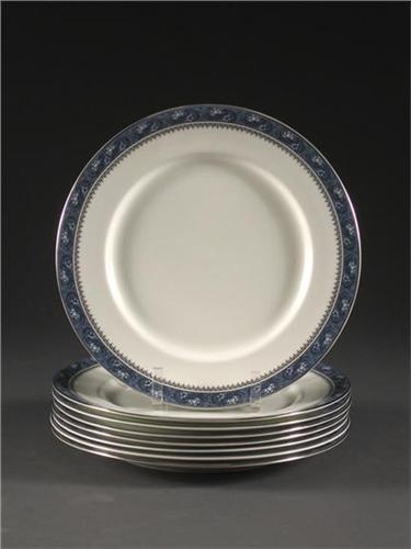 Eight Aynsley Blue Mist pattern dinner plates, 10.5'' D, late 20th c. No chips, cracks or discoloration.