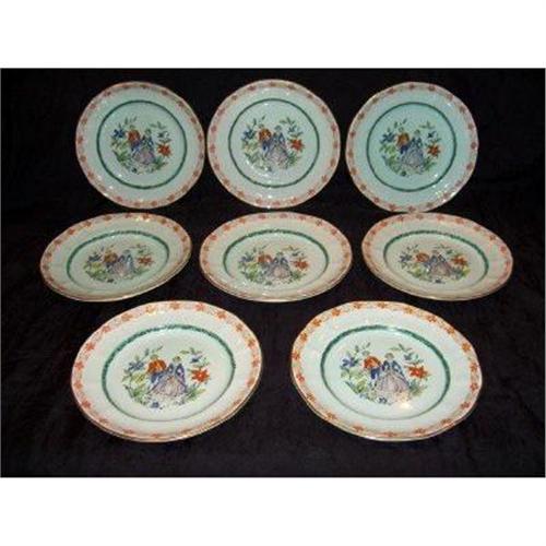 We have a set of eight 7 3/4" salad plates by Adams of England. I have a large number of pieces in this pattern that I acquired at a recent estate sale. The pattern is called "The Piper" and has hand painted enamel decorating. Calyx Ware by Adams has well distinguished characteristics such as hand-enamelled colours on a greenish porcelain glaze. The dinner plates from the set are marked with a history of the Piper on the backs that reads: " A Copy of a pattern brought out when enameling in colours was first introduced in Staffordshire in or about 1755-1760, And is typical of the patterns made by the William Adams of that period" Calyx Ware by Adams was first introduced in 1930, and was made up until 1966 when Adams was acquired by The Wedgwood Group. The plates have bright gold rims and are in very good condition. No chips or cracks. though there is some glaze crazing, It is just crackling with no discoloration.