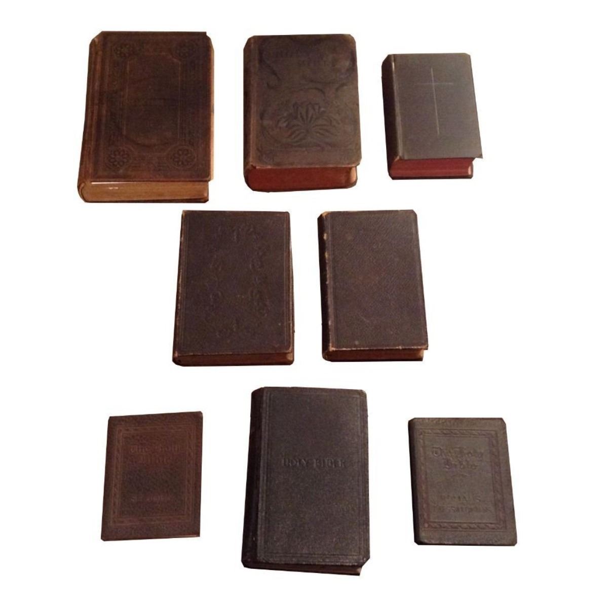 Great set of 8 small bibles and religious books. The earliest one dates to the mid 19th century. Some are inscribed in old inside cover. Great for display as they are small in size. Some age related wear and damage as noted and pictured. - 9187-020118-EB-34828