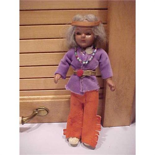 This Apache Indian doll is made of a hard substance. It is bisque, fired clay or porcelain. The doll is is in wonderful condition with no damage or repair. Wig is mohair. Clothing is leather and velvet. There is a tag that says Apache. He has dark sleep eyes with good wax. Painting is very nice and even. Nice doll.