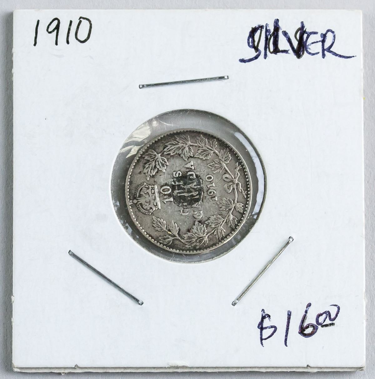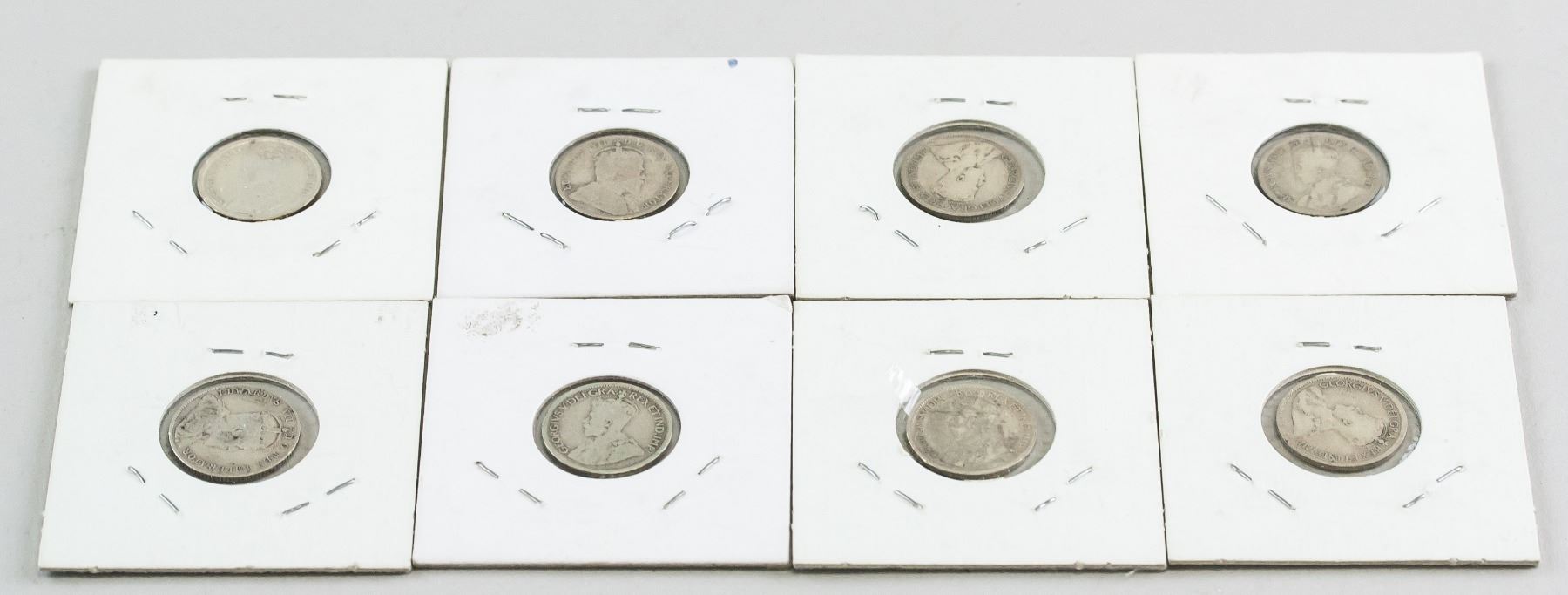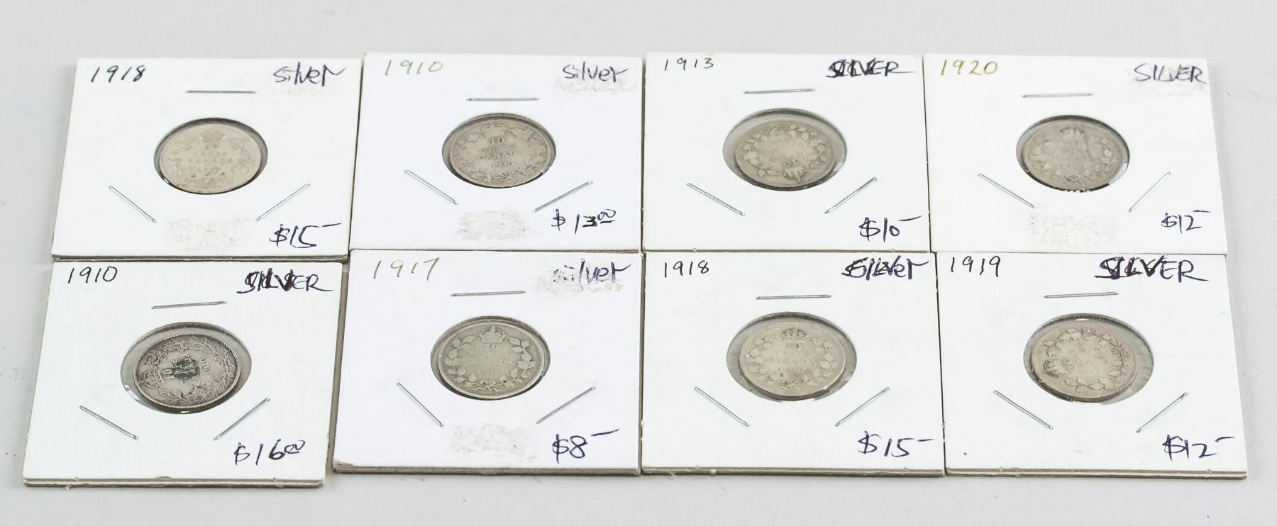 Eight (8) assorted Canadian silver dime coins. Frome 1910 to 1920. Total weight: 40 grams, Approx. Diameter: 18mm