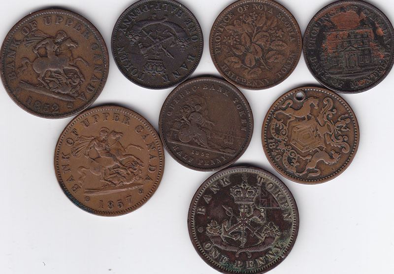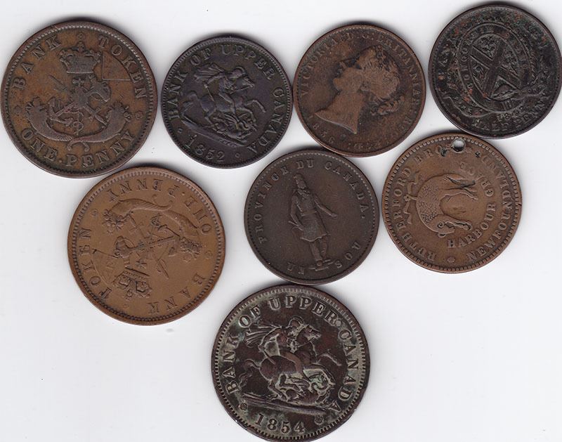 8 Assorted Pre-Confederation Canadian Tokens/Pennies Newfoundland, Quebec, Upper Canada, Bank of Montreal & Nova Scotia