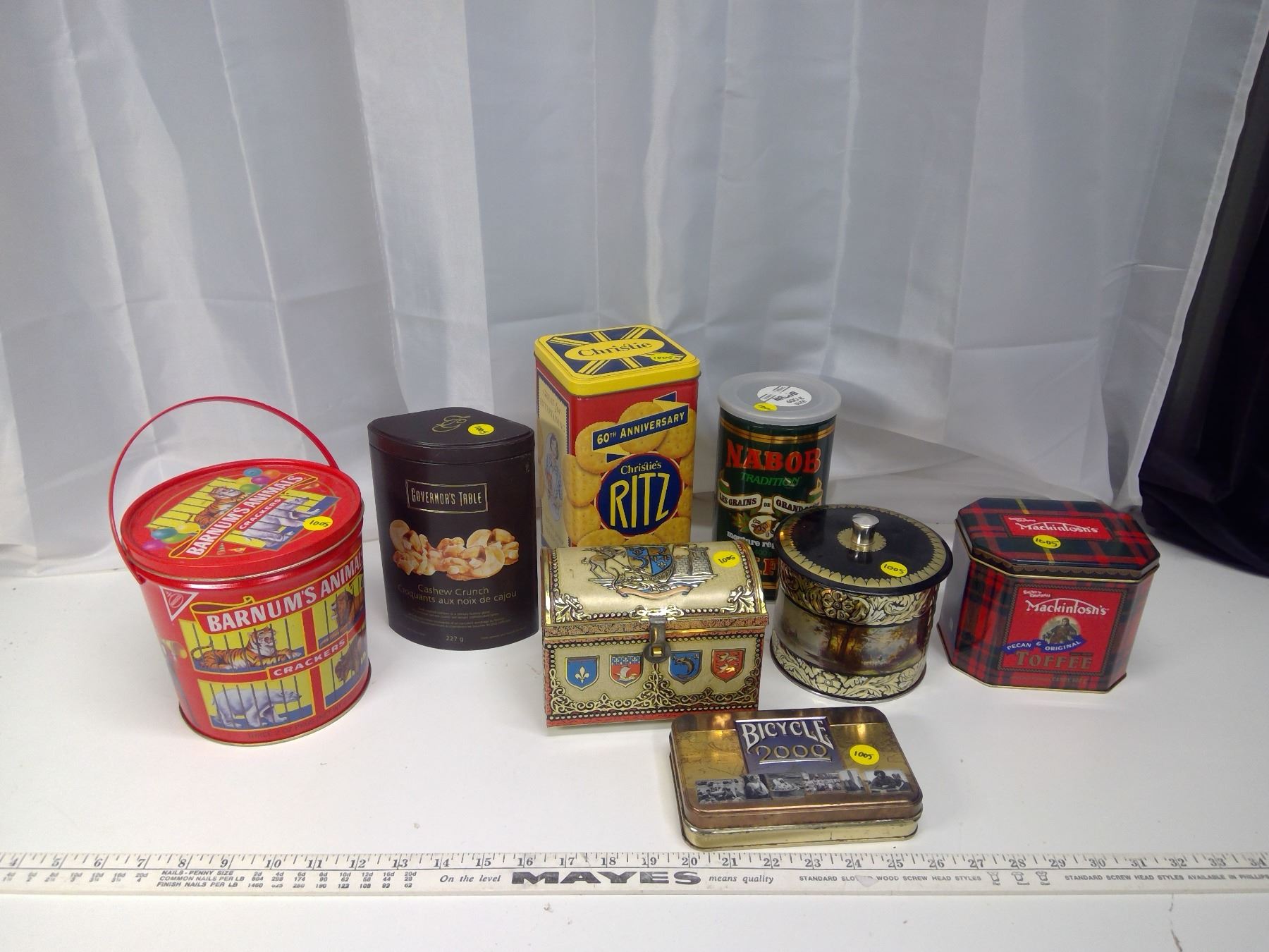 8 Assorted Tins - Animal Crackers, Governor's Table, Ritz, Bicycle, Mackintosh