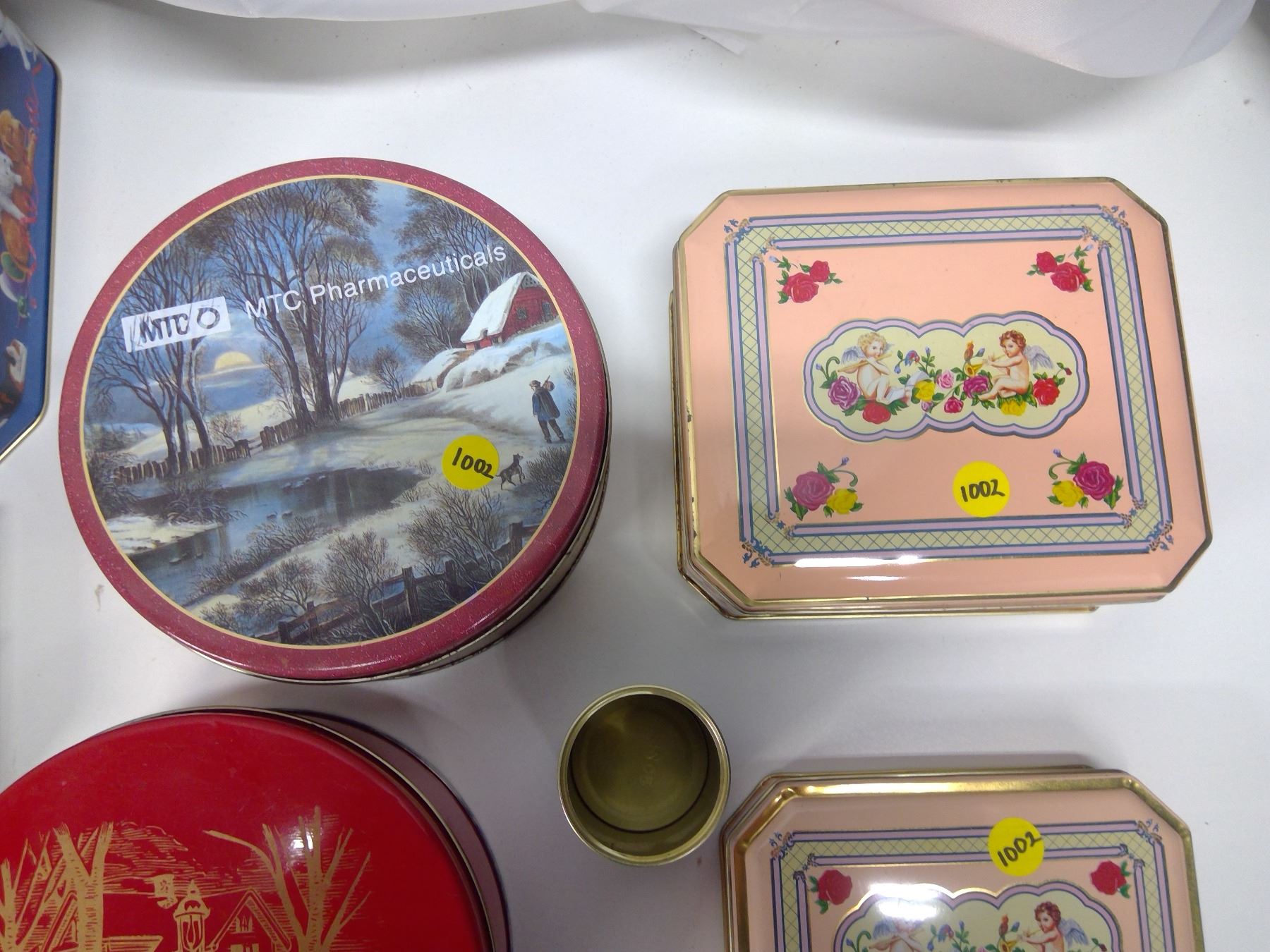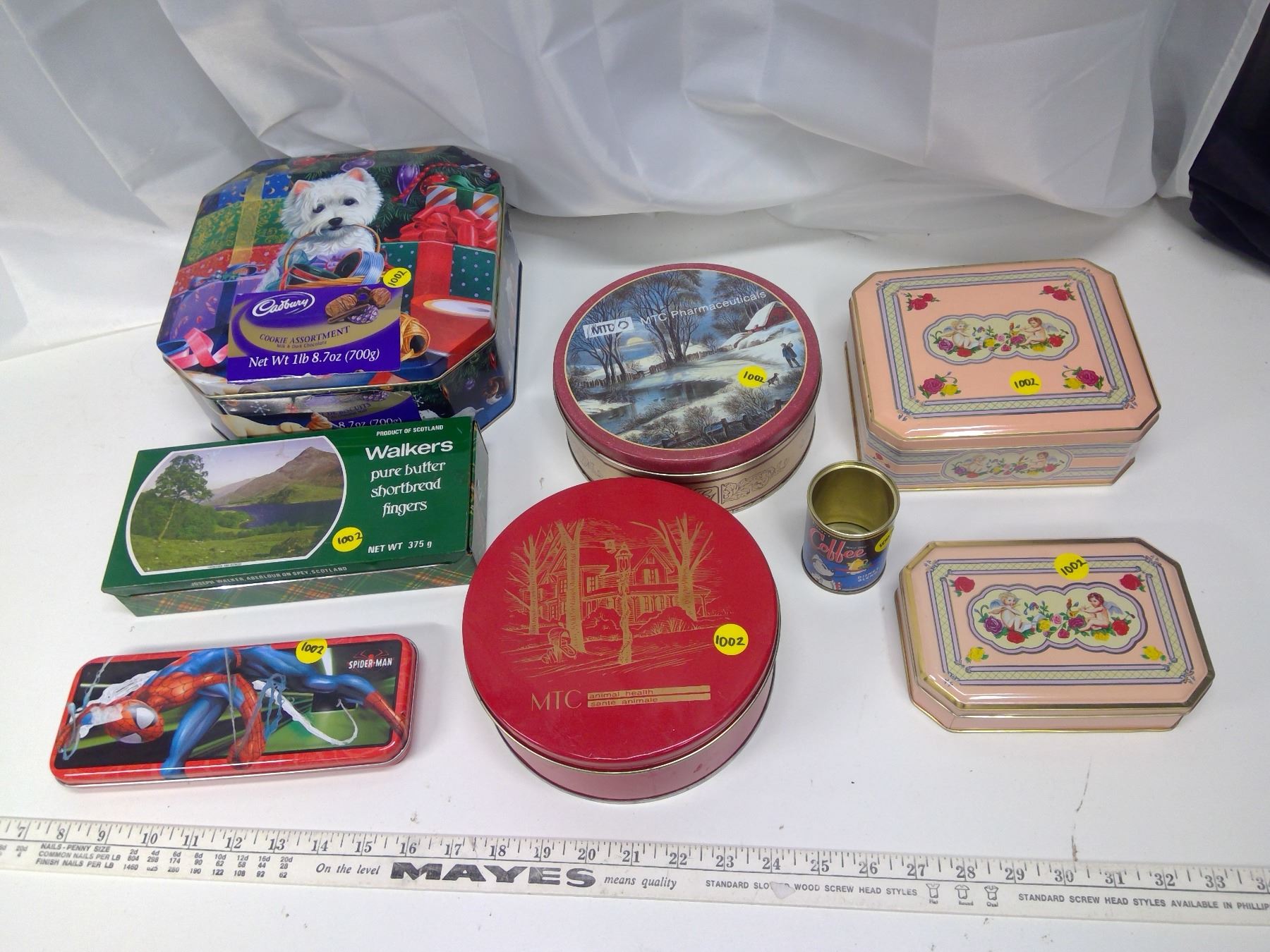 8 Assorted Tins - Cadbury, Joseph Walker, Spider-man, MTC, Angels, etc.