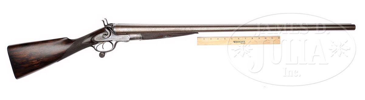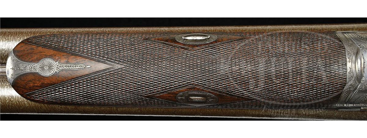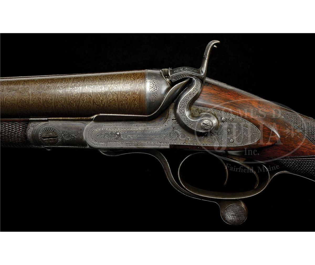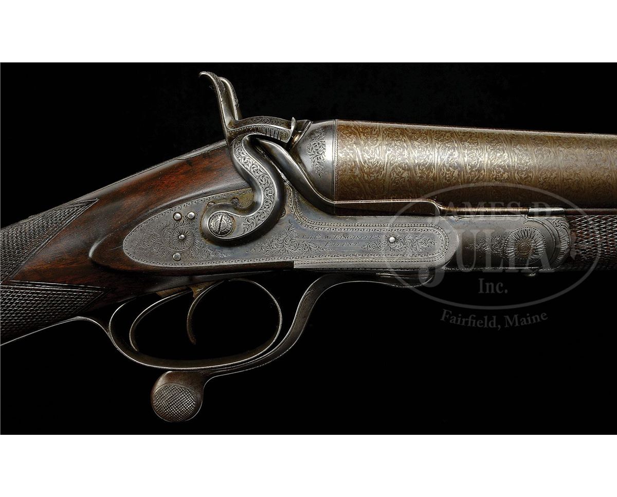 SN 1033. Cal. 8 ga. 3-1/2" Chambers. 34" Fine Damascus bbls with striking pattern, are engraved "CHAs. Wm. LANCASTER'S PATENT CENTRAL FIRE. LONDON. Laminated Steel. No. 1033". Bottoms of bbls are stamped with Birmingham black powder proofs for 9 bore, and with no. "13880". Robust Jones underlever case hardened action is mounted with non-rebounding bar locks, which have tall, heavily chamfered serpentine hammers. Metal parts are engraved with 60% coverage well cut shaded open scroll. "Chas W. Lancaster's Patent" is on each lockplate. SN "1033" is at grip. Finely marbled European walnut straight grip buttstock measures 13-15/16" over coarsely checkered horn buttplate. Flat top point pattern checkering with mullered borders is at grip, and a vacant silver oval is on toe line. Matching splinter forend attaches to bbl with captive side nail, through engraved oval steel escutcheons. Bore diameter: left-.820, right -.821. Bore restrictions: left -.000 (Cyl), right -.000 (Cyl). Wall thickness: left -.040, right -.040. Drop at heel: 2-7/8", drop at comb: 1-3/4". Weight: 11 lbs. 8 oz. LOP: 13-15/16". CONDITION: Very fine, as partially refinished. Bbls retain essentially all of an exceptionally fine re-brown, giving excellent definition to pattern. Engraving is still sharp. Other metal parts retain most of their orig case hardening color, which is quite vivid where protected, pleasingly silvered at normal points of wear. Buttstock retains nearly all of a later rubbed oil finish over some cracks and inlet patches (original) on butt. Checkering is lightly worn, has not been re-cut. Bores are very fine, bright and shiny throughout, slightly frosted. Action is tight. Locks are crisp. A high quality, solid, good looking, Birmingham made gun. 4-48709 MGM158