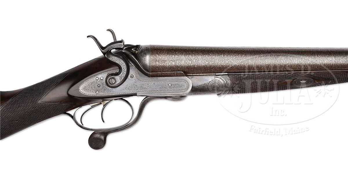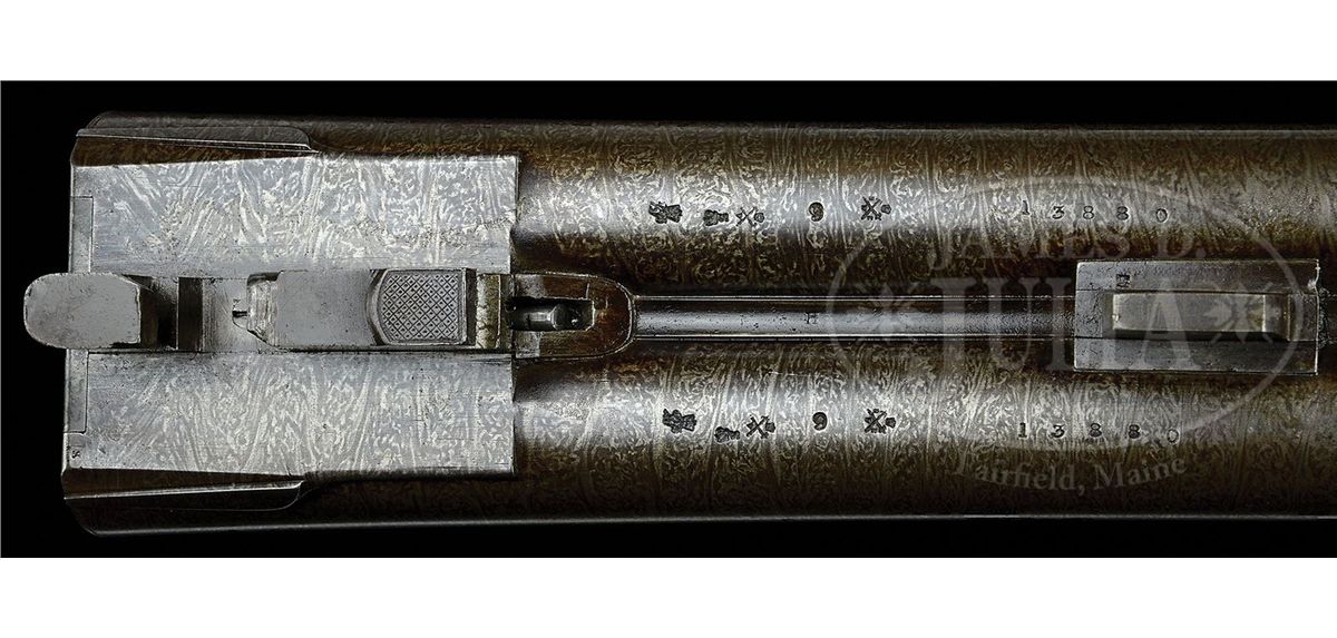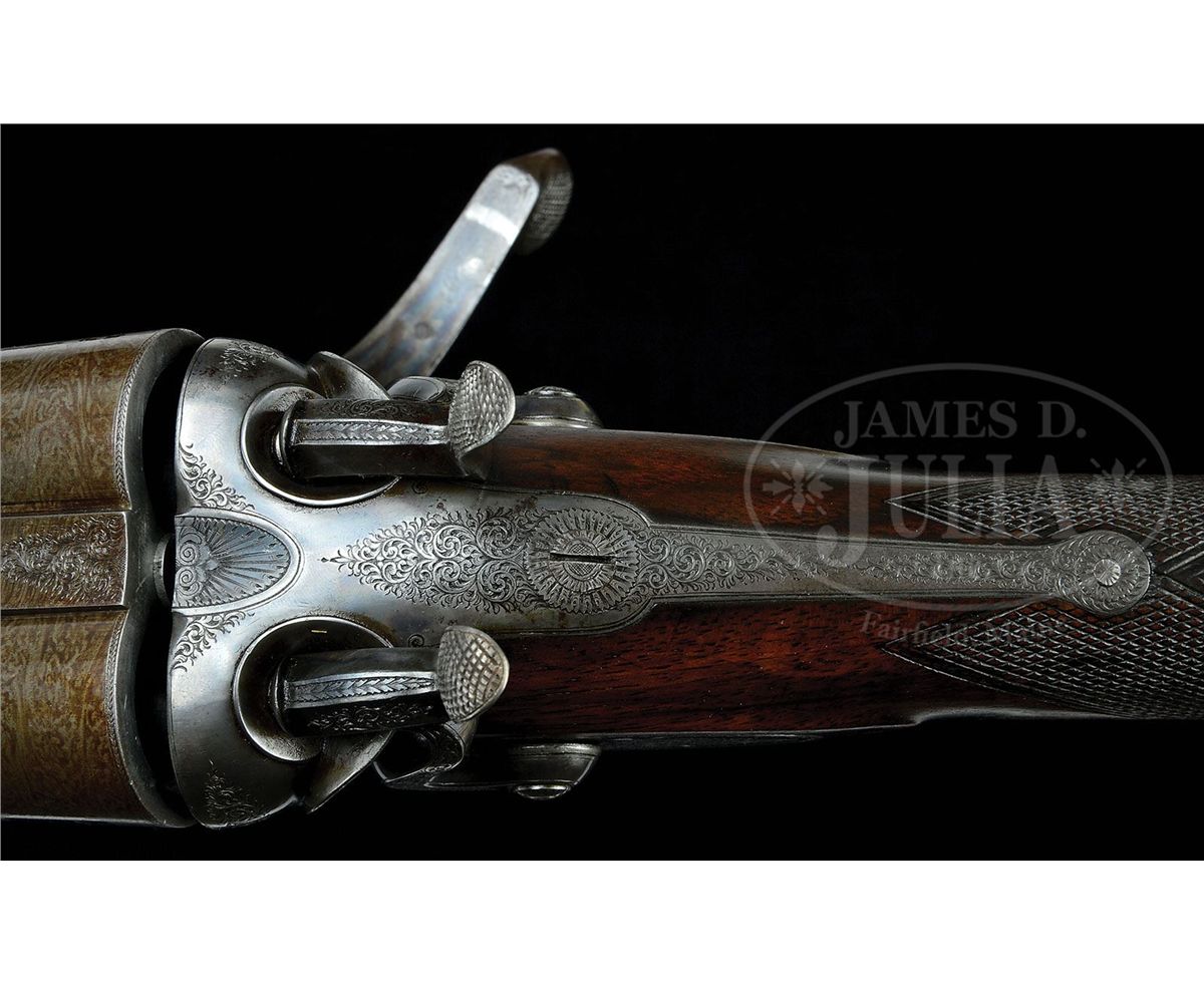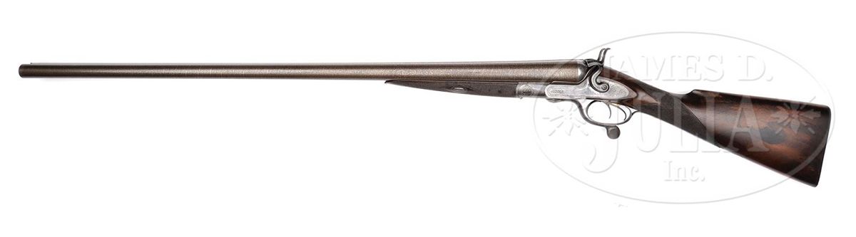 SN 1033. Cal. 8 ga. 3-1/2" Chambers. 34" Fine Damascus bbls with striking pattern, are engraved "CHAs. Wm. LANCASTER'S PATENT CENTRAL FIRE. LONDON. Laminated Steel. No. 1033". Bottoms of bbls are stamped with Birmingham black powder proofs for 9 bore, and with no. "13880". Robust Jones underlever case hardened action is mounted with non-rebounding bar locks, which have tall, heavily chamfered serpentine hammers. Metal parts are engraved with 60% coverage well cut shaded open scroll. "Chas W. Lancaster's Patent" is on each lockplate. SN "1033" is at grip. Finely marbled European walnut straight grip buttstock measures 13-15/16" over coarsely checkered horn buttplate. Flat top point pattern checkering with mullered borders is at grip, and a vacant silver oval is on toe line. Matching splinter forend attaches to bbl with captive side nail, through engraved oval steel escutcheons. Bore diameter: left-.820, right -.821. Bore restrictions: left -.000 (Cyl), right -.000 (Cyl). Wall thickness: left -.040, right -.040. Drop at heel: 2-7/8", drop at comb: 1-3/4". Weight: 11 lbs. 8 oz. LOP: 13-15/16". CONDITION: Very fine, as partially refinished. Bbls retain essentially all of an exceptionally fine re-brown, giving excellent definition to pattern. Engraving is still sharp. Other metal parts retain most of their orig case hardening color, which is quite vivid where protected, pleasingly silvered at normal points of wear. Buttstock retains nearly all of a later rubbed oil finish over some cracks and inlet patches (original) on butt. Checkering is lightly worn, has not been re-cut. Bores are very fine, bright and shiny throughout, slightly frosted. Action is tight. Locks are crisp. A high quality, solid, good looking, Birmingham made gun. 4-48709 MGM158