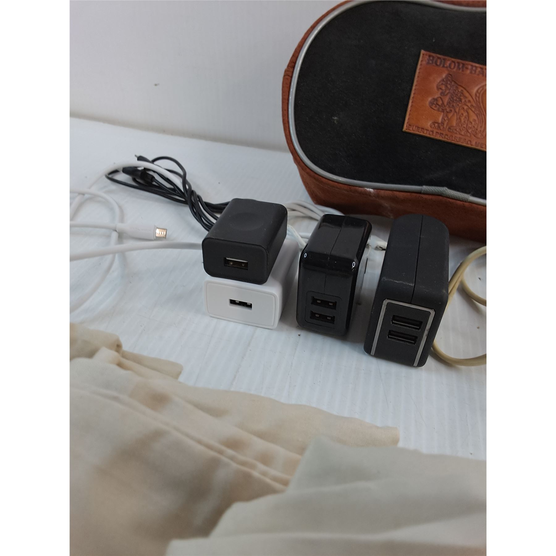 (8) Beige Pillow Cases, Assorted USB Power Outlets/Cords, Vintage Metal Desk Lamp, Amenity Bag