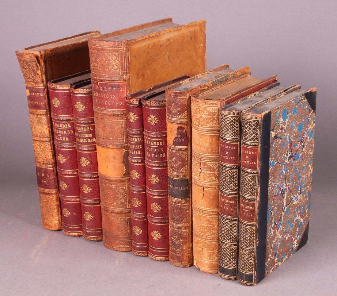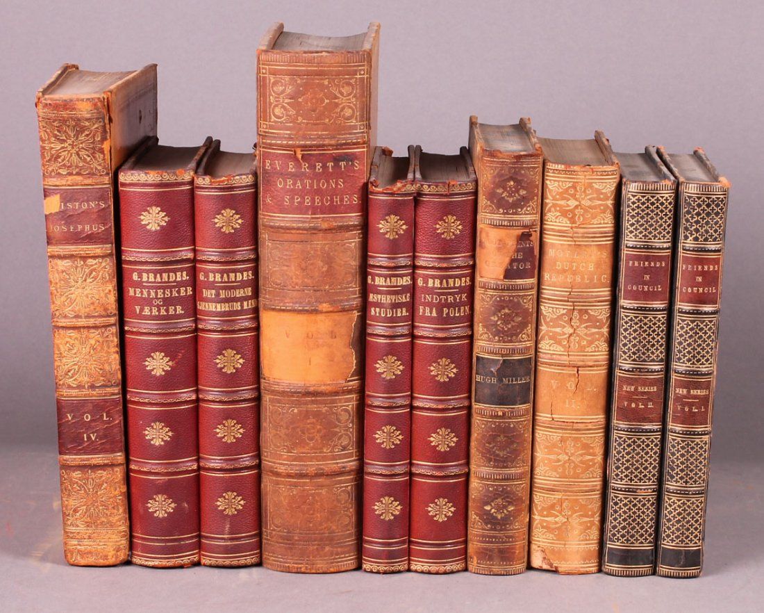 [History/Geography/Louis Agassiz]. 9 Titles (10 Vols). Vp:vp. 12mo/8vo. Half/full leather. ++ John Lothrop Motley. THE RISE OF THE DUTCH REPUBLIC. A History. Vol II (of 3). Lon: Routledge, Warne, and Routledge, 1862. Prize binding. Gilt-stamped on front cover: ?Royal Military College. Presented for Exemplary Conduct,? with an armorial symbol. Joints starting. ++ FRIENDS IN COUNCIL: A Series of Readings and Discourse thereon. 2 Vols: Vols I-II, New Series. NY: James Miller, 1863. ++ Hugh Miller. THE FOOT-PRINTS OF THE CREATOR: Or, the Asterolepis of Stromness... From the Third London Edition. With a Memoir of the Author by Louis Agassiz. Bos: Guld and Lincoln, 1860. ++ [EVERETT?S ORATIONS AND SPEECHES]. Vol I only. Lacking title and other leaves preceding preface. Title given above is binder?s spine label. Volume number spine label lacking. Contents foxed. ++ THE WORKS OF FLAVIUS JOSEPHUS, The Learned and Authentic Jewish Historian and Celebrated Warrior. Vol IV (of 4). William Whiston translator. 1820. ++ George Brandes. INDTRYK FRA POLEN. Copenhagen: Gyldendalke Boghandels Forlag (F. Hegel & Son). Graebes Botrykkeri. 1888. ++ Brandes. MENNESKER OG VAERKER. 1883. ++ G. Brandes. AESTHETISKE STUDIER. 1868. ++ Brandes. DET MODERNE GJENNEMBRUDS MAEND, En Raekke Portraeter. 1883. ++