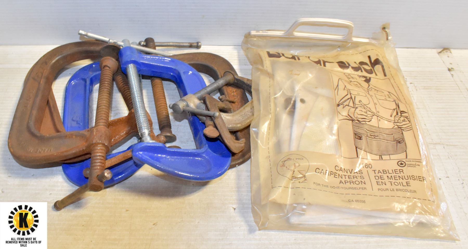 8 C-CLAMPS W/ CANVAS CARPENTERS APRON