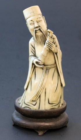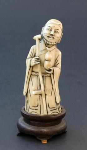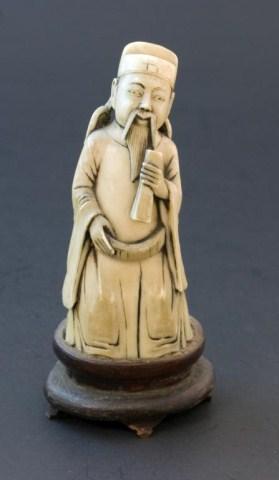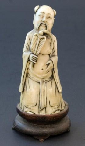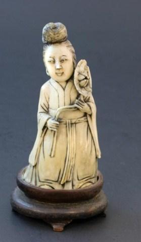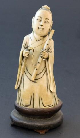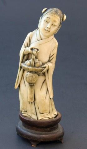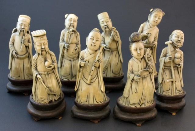 Depicts 8 Men & Women all holding a different item. All are made by the same artist. Each has a footed teakwood base. Tallest piece is 3 1/2" height + 1" base. Shortest piece is 3" + 1" base.