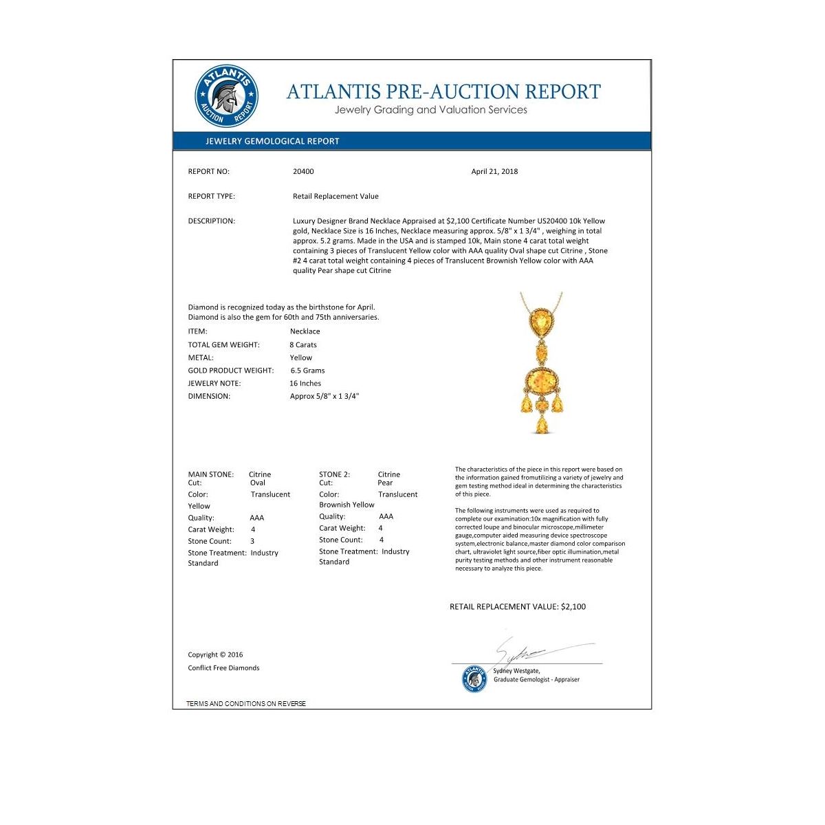 REF-34H4A -20400 ---- 8 CTW Citrine Necklace Designer Vintage 10K Yellow Gold ---- Luxury Designer Brand Necklace Appraised at $2,100 Certificate Number US20400 10k Yellow gold, Necklace Size is 16 Inches, Necklace measuring approx. 5/8" x 1 3/4" , weighing in total approx. 5.2 grams. Made in the USA and is stamped 10k, Main stone 4 carat total weight containing 3 pieces of Translucent Yellow color with AAA quality Oval shape cut Citrine , Stone #2 4 carat total weight containing 4 pieces of Translucent Brownish Yellow color with AAA quality Pear shape cut Citrine