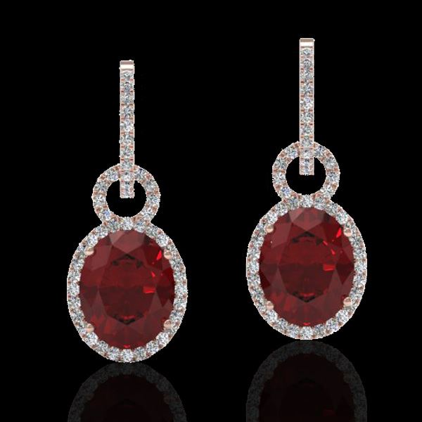 REF-100T2M -22737 ---- 8 CTW Garnet & Micro Pave Solitaire Halo VS/SI Diamond Earrings 14K Rose Gold ---- Luxury Designer Brand Earring Appraised at $6,600 Certificate Number US22737 14k Rose gold, Earring Size is 1 Inches, Earring measuring approx. 1" x 1/2" , weighing in total approx. 5.7 grams. Made in the USA and is stamped 14k, Main stone 7.2 carat total weight containing 2 pieces of Saturated purplish Red color with AAA quality Oval shape cut Garnet , Stone #2 0.8 carat total weight containing 90 pieces of H-I color with VS/SI quality Round shape cut Diamond