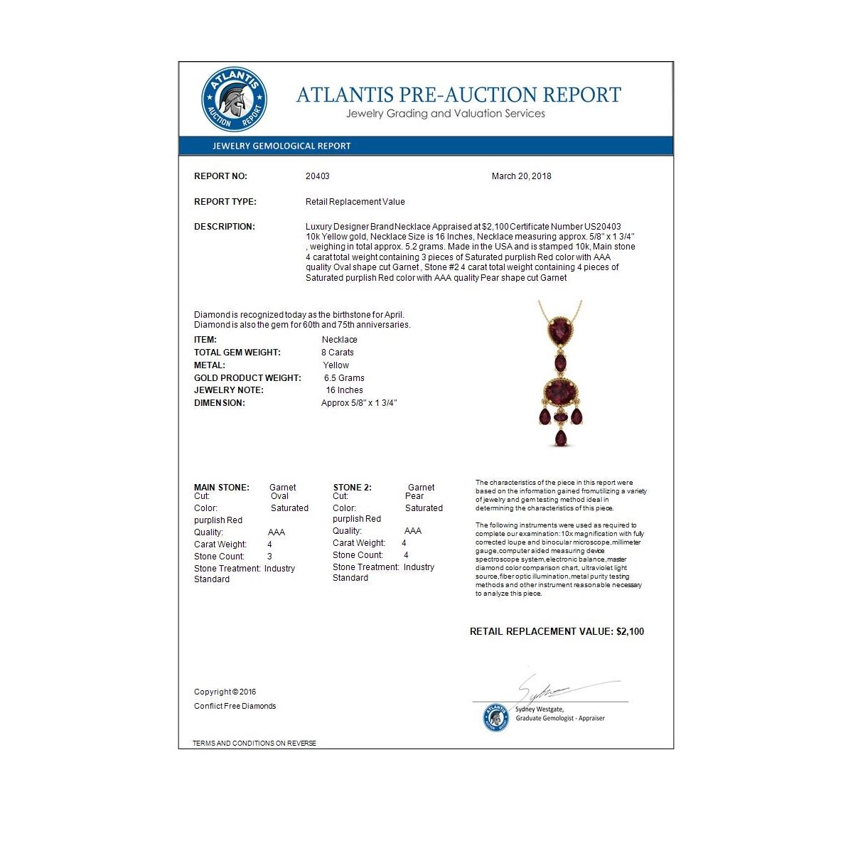 REF-34Y4K -20403 ---- 8 CTW Garnet Necklace Designer Vintage 10K Yellow Gold ---- Luxury Designer Brand Necklace Appraised at $2,100 Certificate Number US20403 10k Yellow gold, Necklace Size is 16 Inches, Necklace measuring approx. 5/8" x 1 3/4" , weighing in total approx. 5.2 grams. Made in the USA and is stamped 10k, Main stone 4 carat total weight containing 3 pieces of Saturated purplish Red color with AAA quality Oval shape cut Garnet , Stone #2 4 carat total weight containing 4 pieces of Saturated purplish Red color with AAA quality Pear shape cut Garnet