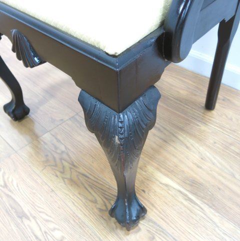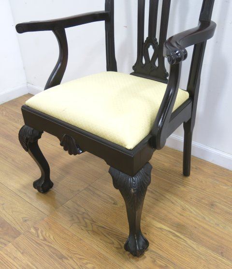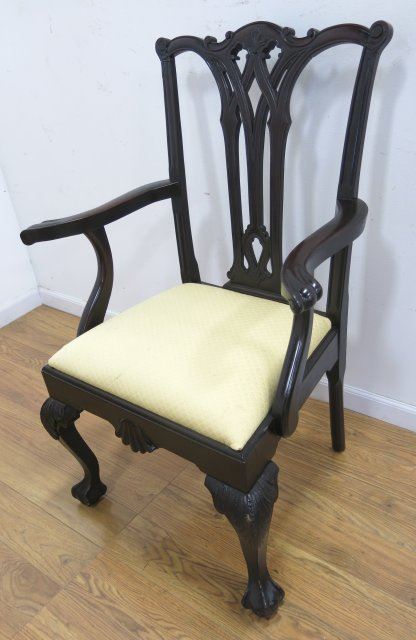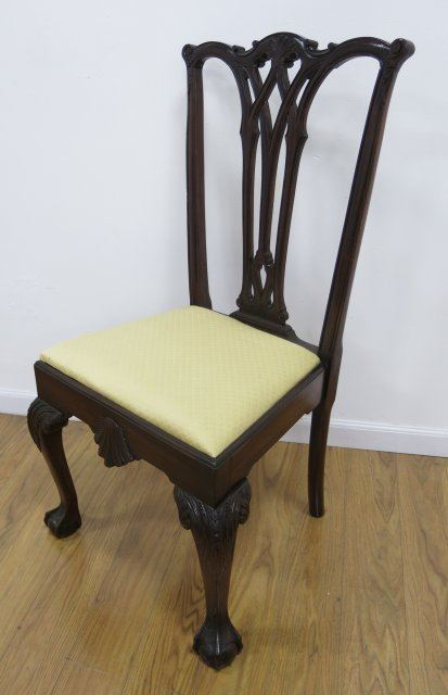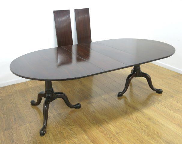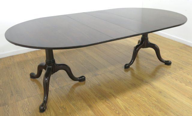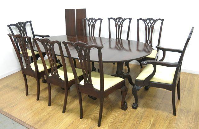 Ball and claw legs. 2 armchairs, 6 side chairs. Mahogany double pedestal dining room table with 4 leaves. Table approx. 29" H x 66" W x 48" D without leaf; leaf approx. 12" W x 48" D.