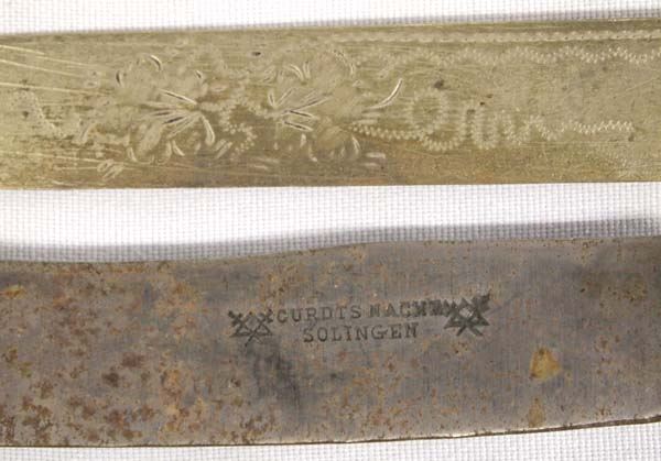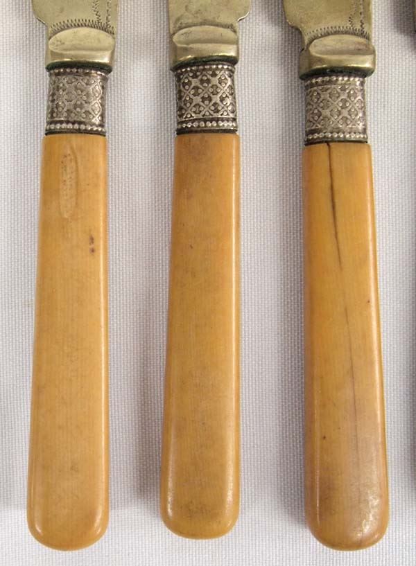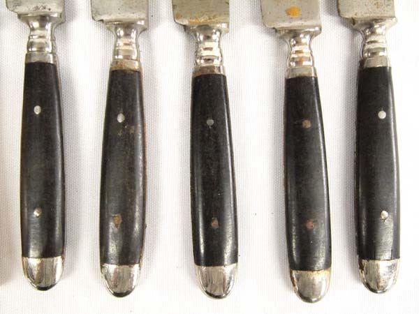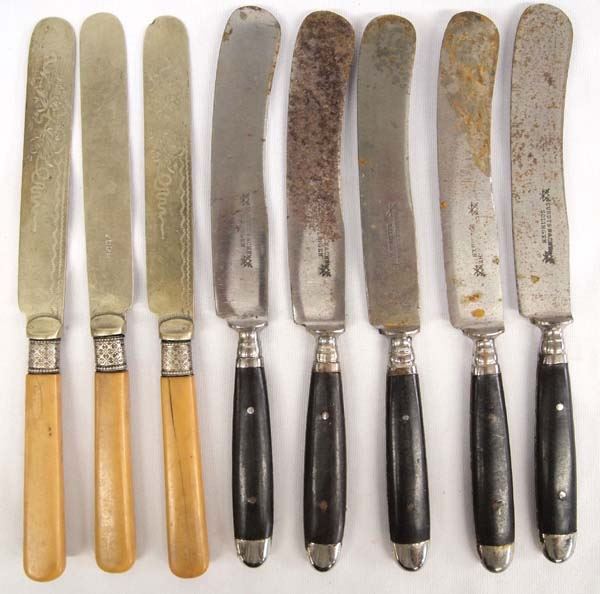 8 Civil War Era Bone Handles Knives, measure 8''L, the dark handled knife blades are marked ''Curdts Nache Solingen, the 3 light handled knife blades are etched on one side and hallmarked on the other PNSS